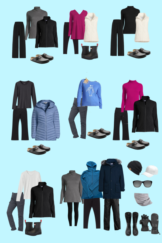 I try to pack a capsule wardrobe that allows me to coordinate pieces to make different outfits, but this trip was definitely not a fashion show. I start with a couple neutral base colors for pants, such as black and gray, then add a couple brighter colors to create multiple looks. This time I used ivory, blue, and burgundy in my tops and sweaters. I did not pack any jewelry for this trip, nor did I pack any scarves as I usually do. There was simply no need for any of that. The collage represents all the clothing I took, and some of the ways I wore it. The bottom right is how I dressed for the Zodiac rides. My complete packing list is posted at the bottom of this article.