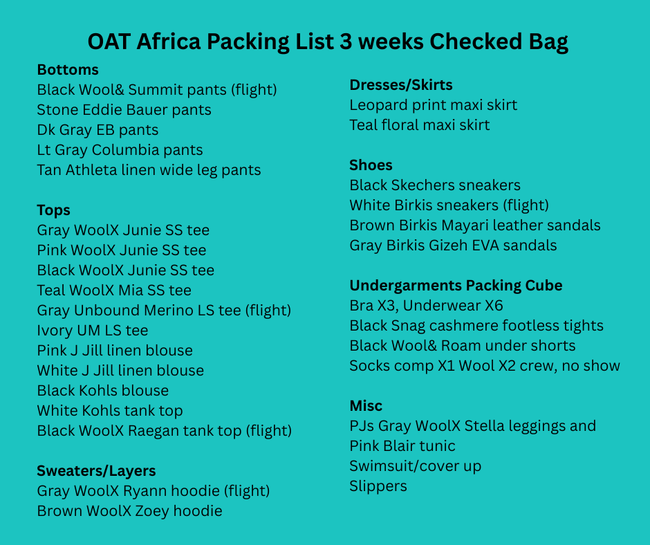 Below I have posted my actual packing list for our Ultimate Africa trip with Overseas Adventure Travel in September 2025. We were gone a total of 22 days. We spent one night in Johannesburg, then began the bush portion of our trip, which lasted two weeks. We spent three days in each of the four different camps we visited. Laundry services were available at each camp for no charge. The camps will not wash your underwear, which they refer to as “smalls,” and three out of the four camps would not wash bras. The laundry is mostly done by hand and hung on a line to dry, as all the camps run on solar power. We knew all this beforehand, and had no problem hand washing bras and underwear.