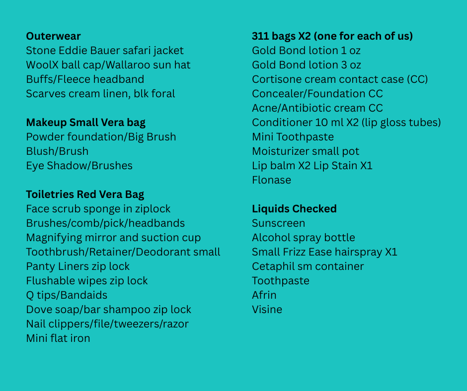 Even though we checked our bags, I still pared down all my liquids and carried most of them with me in my backpack. No sense carrying extra weight, it’s easy to do, and I like to have them with me in case my bags are lost. We also cross packed our clothing. We normally pack one outfit in each other’s bag, and one outfit in our backpacks. In the case of a lost bag, we both still have clothes to wear.