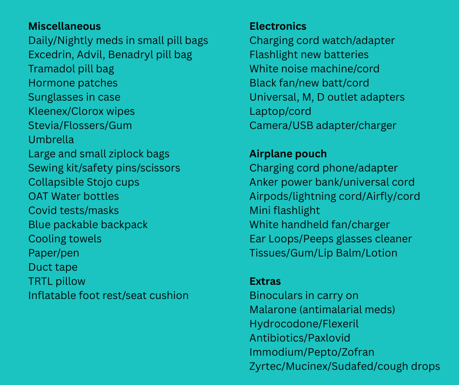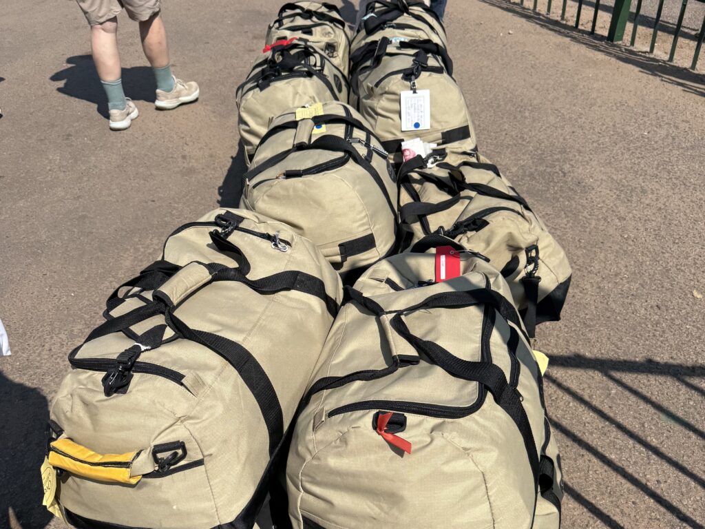 We checked our bags for this trip. OAT requires you to take a frameless rolling duffle, and they gift it to you, along with water bottles, about a month before your trip. It’s too large for carry-on. You can take your own bag, but it must be a frameless duffle to fit into the bush planes and the safari jeep trailers. Everyone on our trip brought the OAT supplied bags. Put something colorful on it to easily identify it from all the others. We used reg luggage tags and a shower pouf on the other end. We had more room than we needed, so filled our bags with several pair of old eyeglasses (prescription and readers) and several pair of older but good condition shoes that we donated at the first camp. We asked our Trip Leader and the camp director privately before doing so and they were very appreciative.  While I am normally not a packing cube fan, I used them on this trip because that duffel was like a huge black hole and had no organizing pockets of any kind. Without the cubes, all my stuff would have just been thrown in all willy nilly, and we can’t have willy nilly.