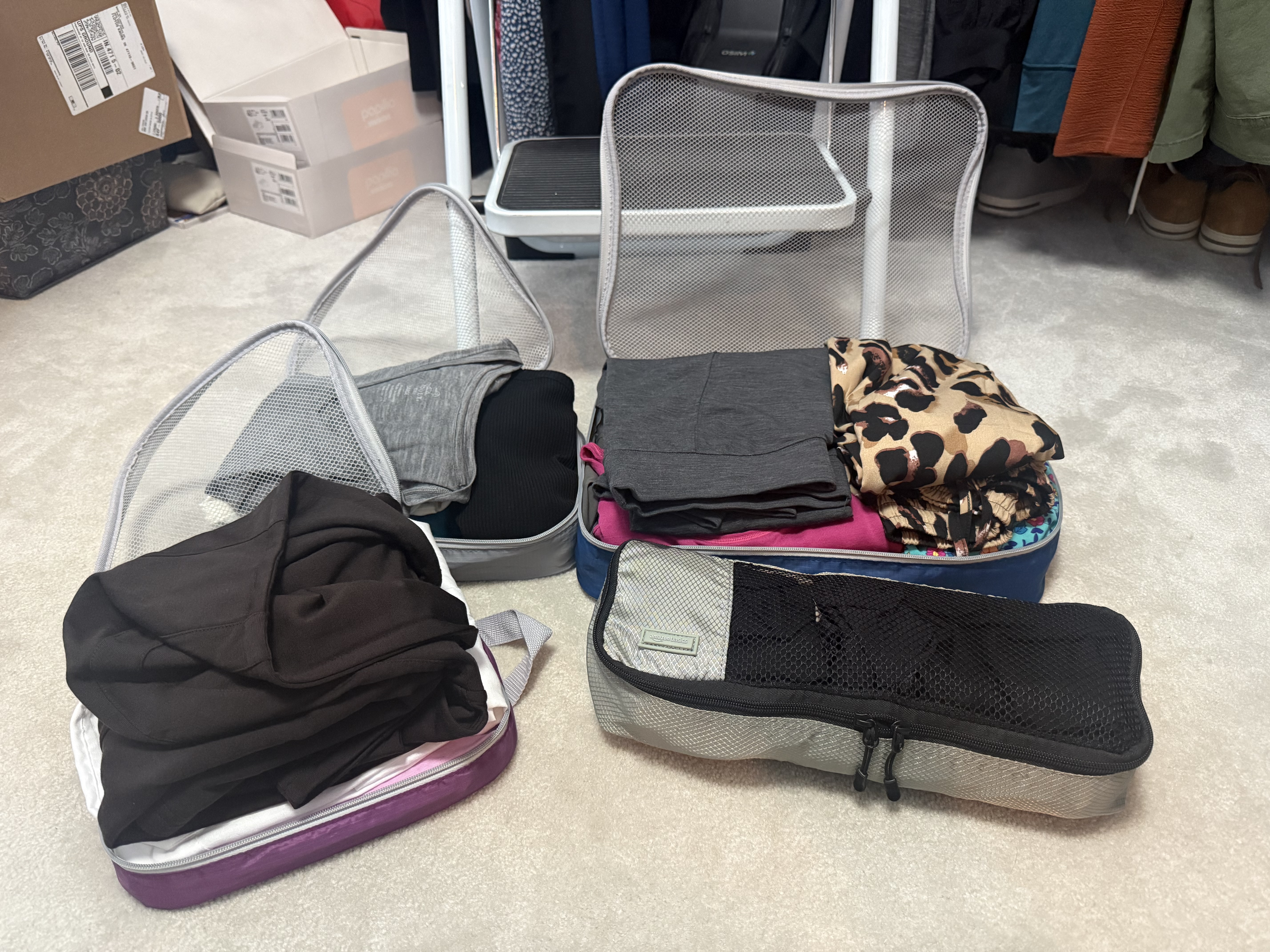 Clothes in packing cubes because that duffle was a black hole
