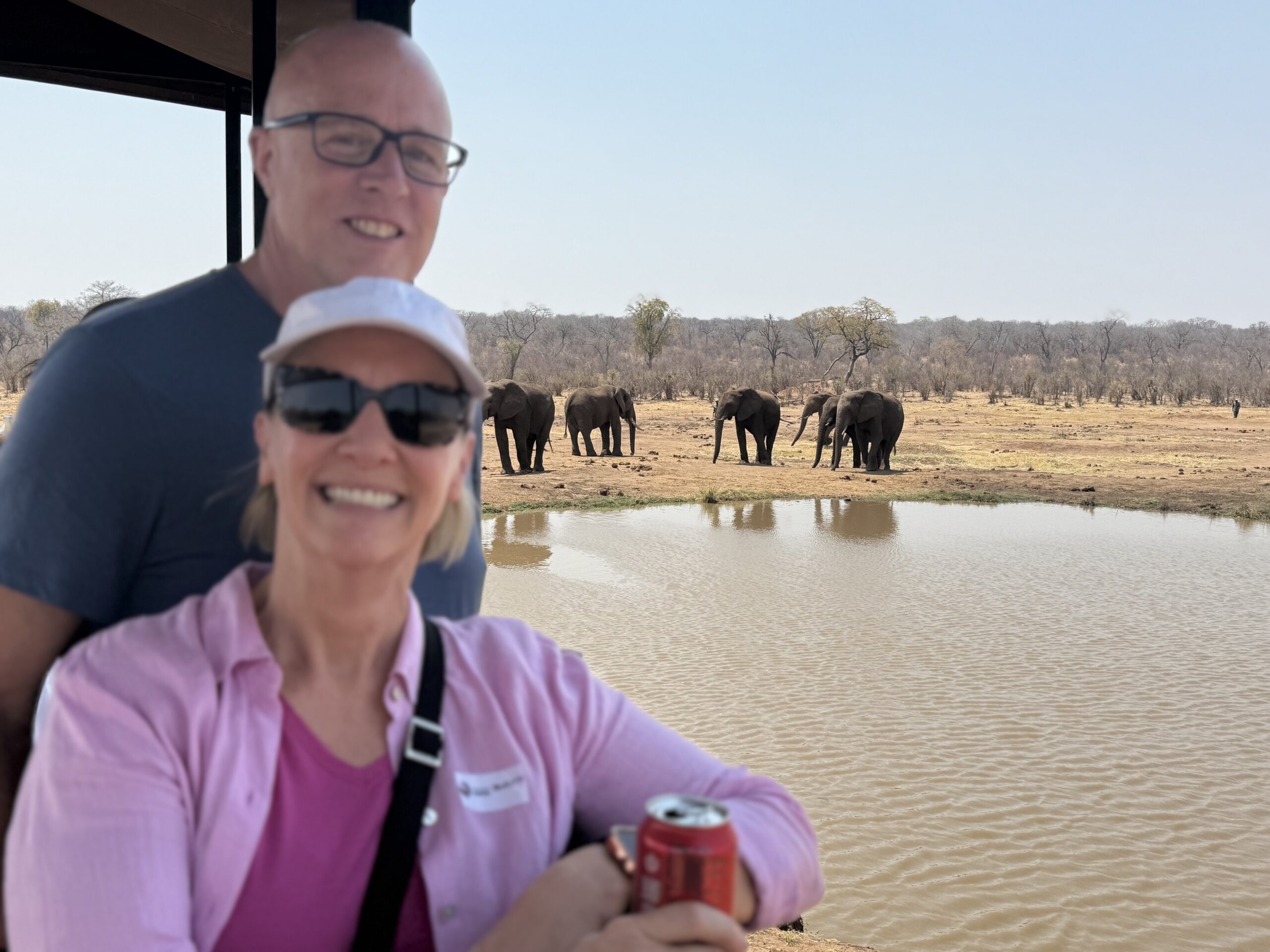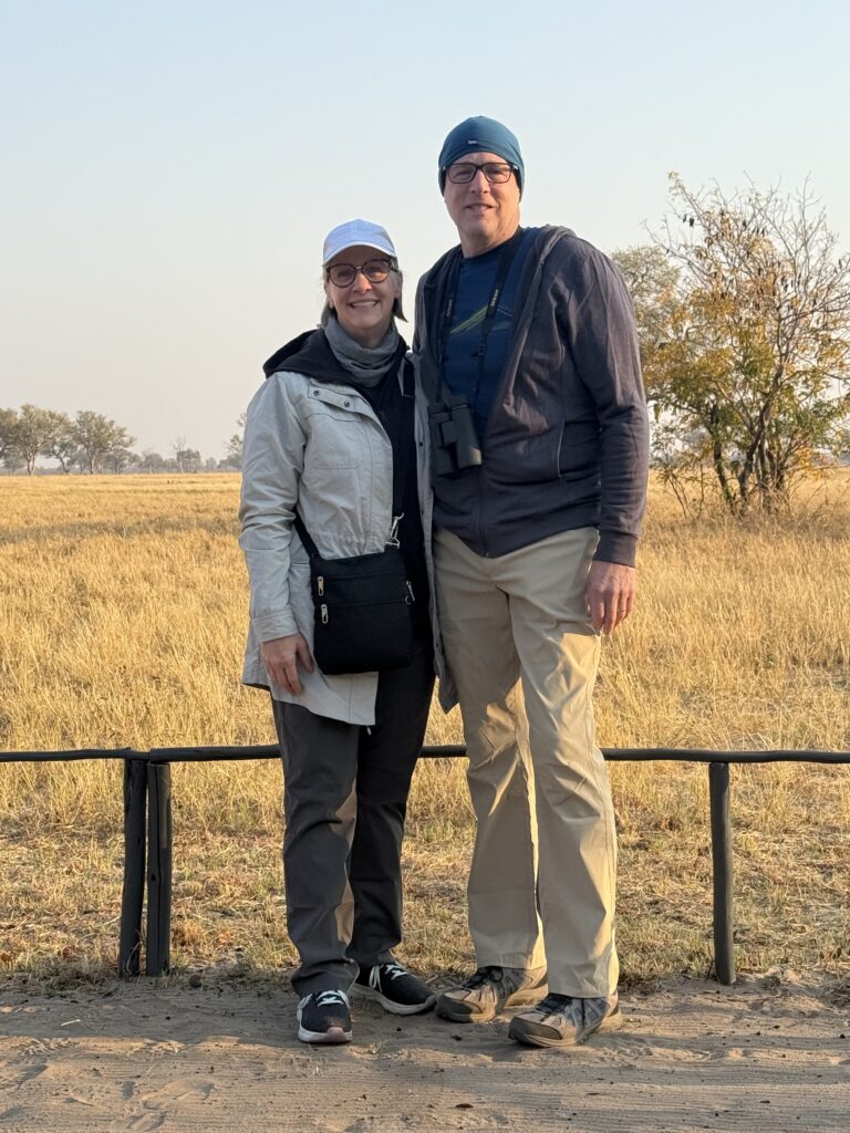 We went in September, which is late winter there. The temps were forecast to be in the 90’s F during the day in Zimbabwe, Zambia, and Botswana, with lows in the 50’s F. We each took two merino wool hoodies for warmth on morning game drives. The wind in the open air jeeps can be quite chilly at 6 am. I also took a lightweight Eddie Bauer safari jacket as an extra layer. This was all we needed. We did not pack puffer coats or warm winter coats and did not need them. We did wear our warm hats, fleece headbands, and buffs in the morning, and our ball caps or sun hats in the afternoon. Definitely need buffs for the dust.