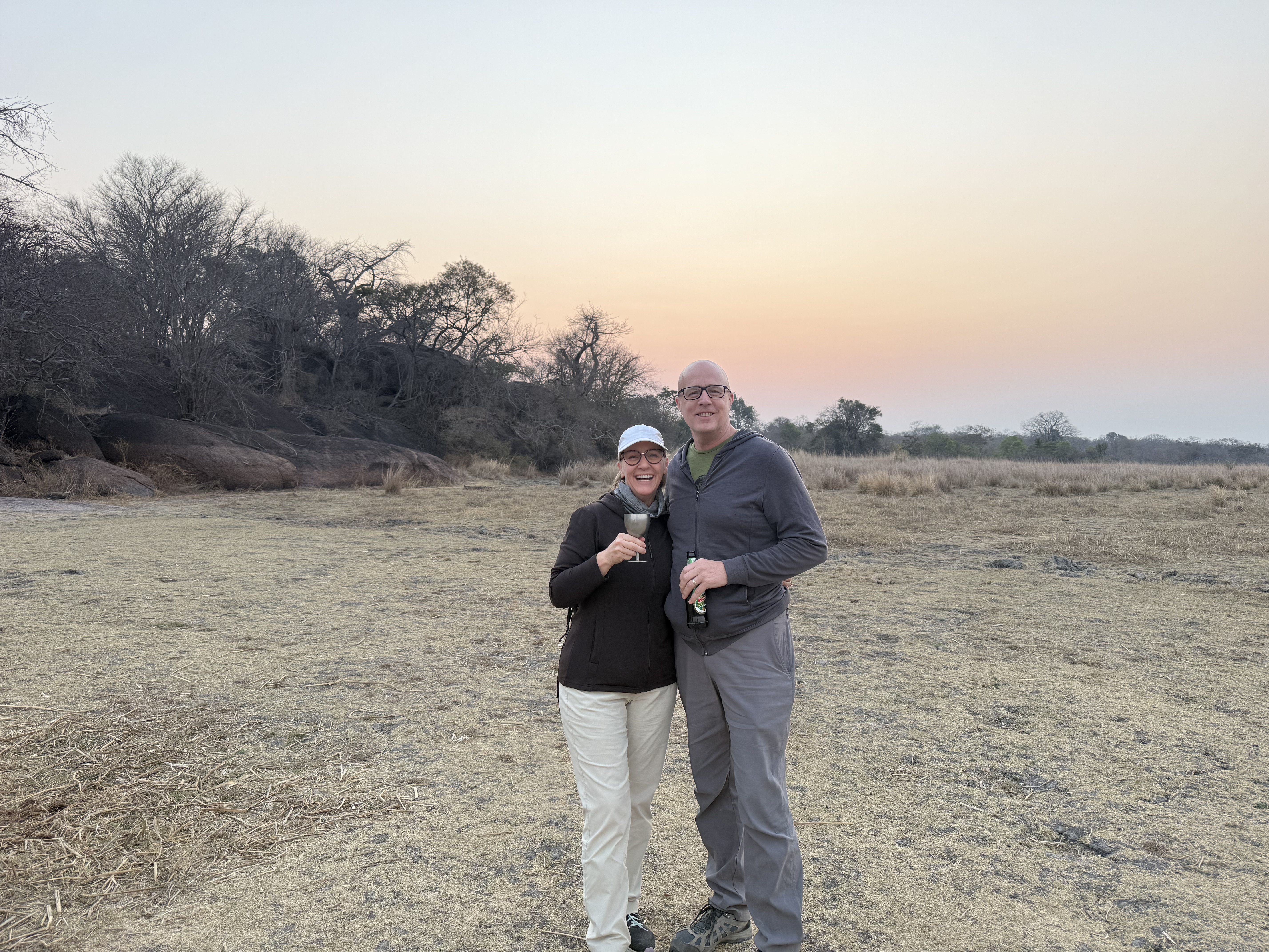 Sundowners in Zambia, wearing typical outfits. Eddie Bauer pants, WoolX tee and WoolX brown hoodie; Steve wearing EB pants, Icebreaker tee, Unbound Merino hoodie