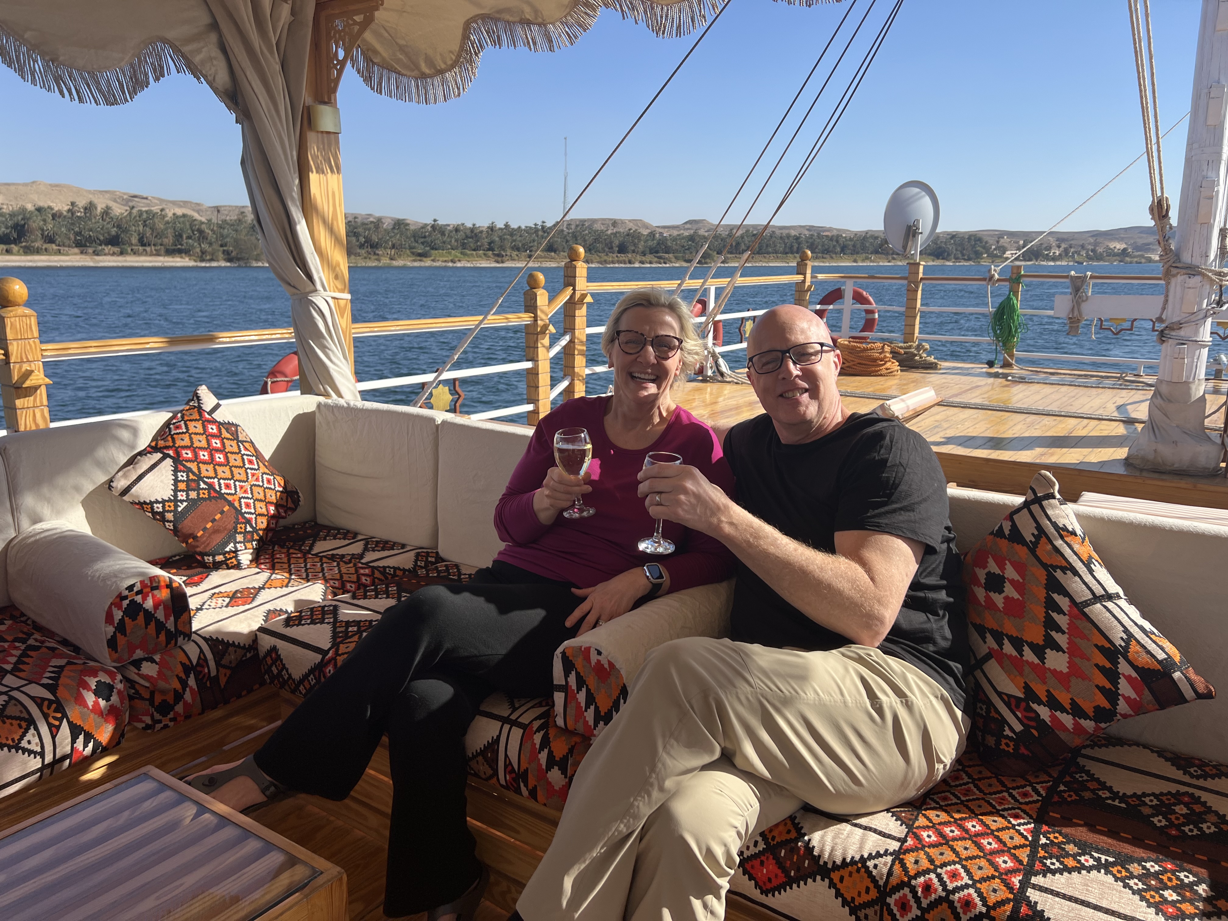 The dress code for this trip is super casual. There are no formal or dressy nights aboard the ship, or dahabeya, which is the non motorized Nile vessel that accommodates 16 passengers. We received a packing list from OAT that explained the need for lightweight, quick dry clothing, and a couple of light layers for chilly evenings and the early morning balloon ride. We like Columbia or Eddie Bauer brand lightweight hiking pants, and we each packed a couple pair of these. We also love Merino wool clothing, and we packed several Merino tees, socks, undergarments, and jackets for this trip. All of these pieces were easily sink washed when needed and were dry in a few hours, or by the next morning. Most folks packed a similar wardrobe, and no one changed into anything fancy for our meals out or on the ship. You will definitely want a sun hat and sunscreen for all the sightseeing. I always pack at least one skirt or casual dress to wear when I want to get out of touring clothes for a bit. This trip I packed a black and white print Rip Skirt and wore it to dinner at a couple of the hotels, along with a black or white tee shirt and a cashmere sweater.