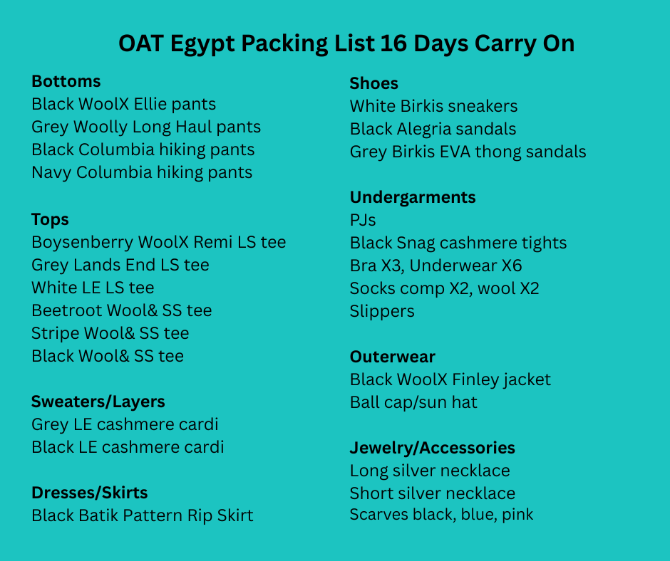 The packing list I have posted below is from our first trip with Overseas Adventure Travel, called Egypt and the Eternal Nile by Private Classic River Yacht. We were gone a total of 16 days in January 2025. Our trip included a three night stay in Cairo, a two night stay in Aswan, a one night stay in Abu Simbel, then a five night Nile River cruise, followed by a two night stay in Luxor, and one final night in Cairo before our flight home. The forecast called for the weather to be in the 70′ and 80’s F during the day, and as low as 40’s F at night. We expected it to feel quite a bit warmer in the Valley of the Kings, due to the location, the landscape, and the lack of any shade, and it definitely felt hot there.