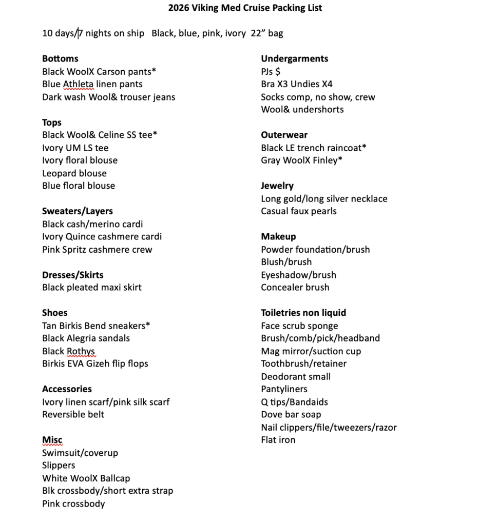I admit I do struggle with planning only three pairs of shoes. I have wide feet and a chronic pain condition, so I sometimes pack two sneakers (often Birkenstock Bend and a Skechers athletic sneaker), flip flop type sandals (Birkenstock Mayari or Gizeh), and either Chelsea boots for cold weather trips, or wedge sandals (Birkenstock Soley) for warm weather cruises. I have a pair of Rothy’s flats that pack really small, so sometimes pack those. It’s very hard for me, as you can see. The struggle is real.