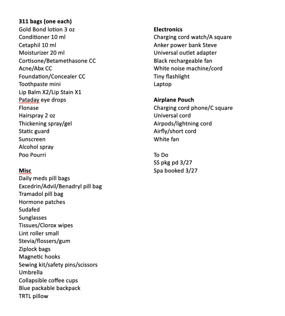 Divide your list into categories for bottoms, tops, layers, shoes, undergarments, outerwear, electronics, jewelry, makeup/toiletries (non liquids), 311 liquids bag, miscellaneous, buy at destination, or any other specific categories you need. See my tips to pack liquid toiletries here. If you are super organized, add which small bags and pouches these items will go into when packing to help you stay organized. I use a variety of zipper pouches, a couple zip lock bags, and other small packs I have collected over the years. Some folks like a hanging toiletry bag. Some folks like packing cubes. I don’t like either of those things in general. However, I do now pack all my undergarments in a single packing cube, to prevent them from being displayed to the public in the case of a random TSA search. Yes, some of the people in line at security in Amsterdam have admired my bras and underwear.