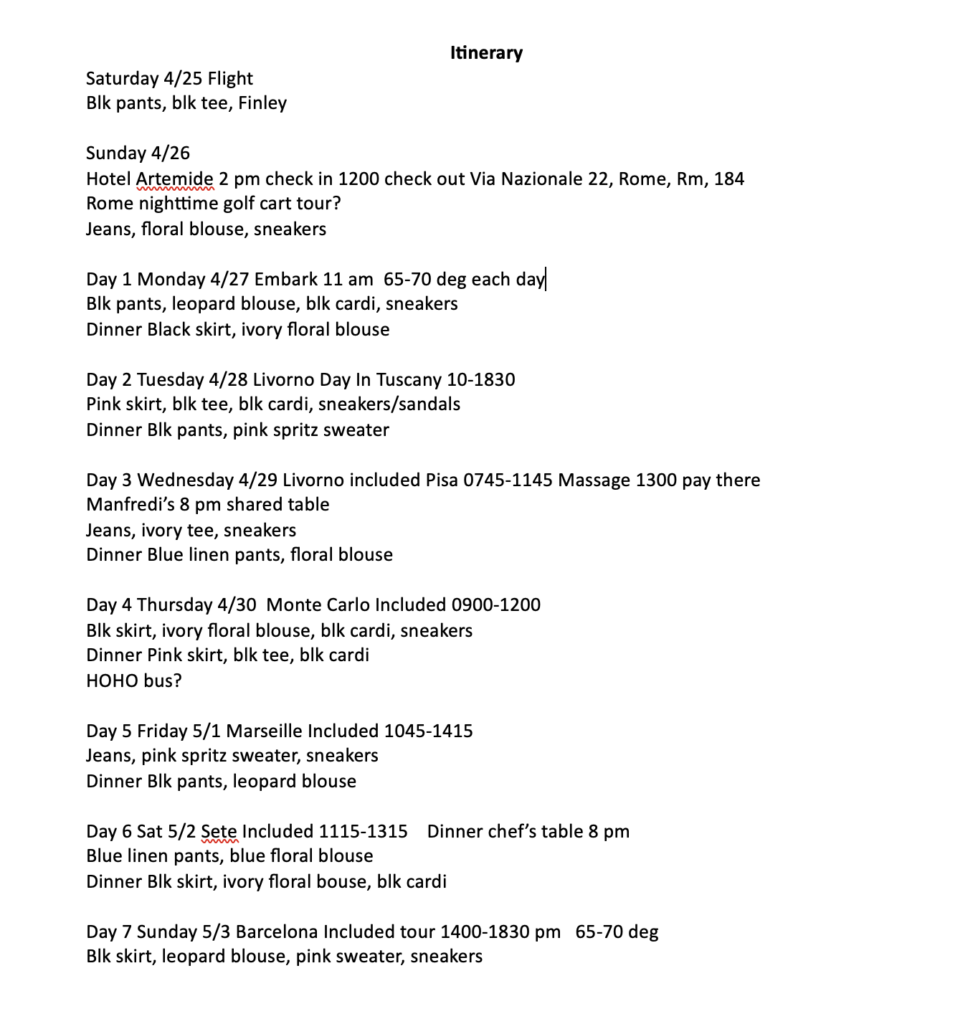 Briefly list what activities are planned for each day. My itinerary with dates goes at the bottom of my clothing list. This will help you add appropriate clothing to your list.