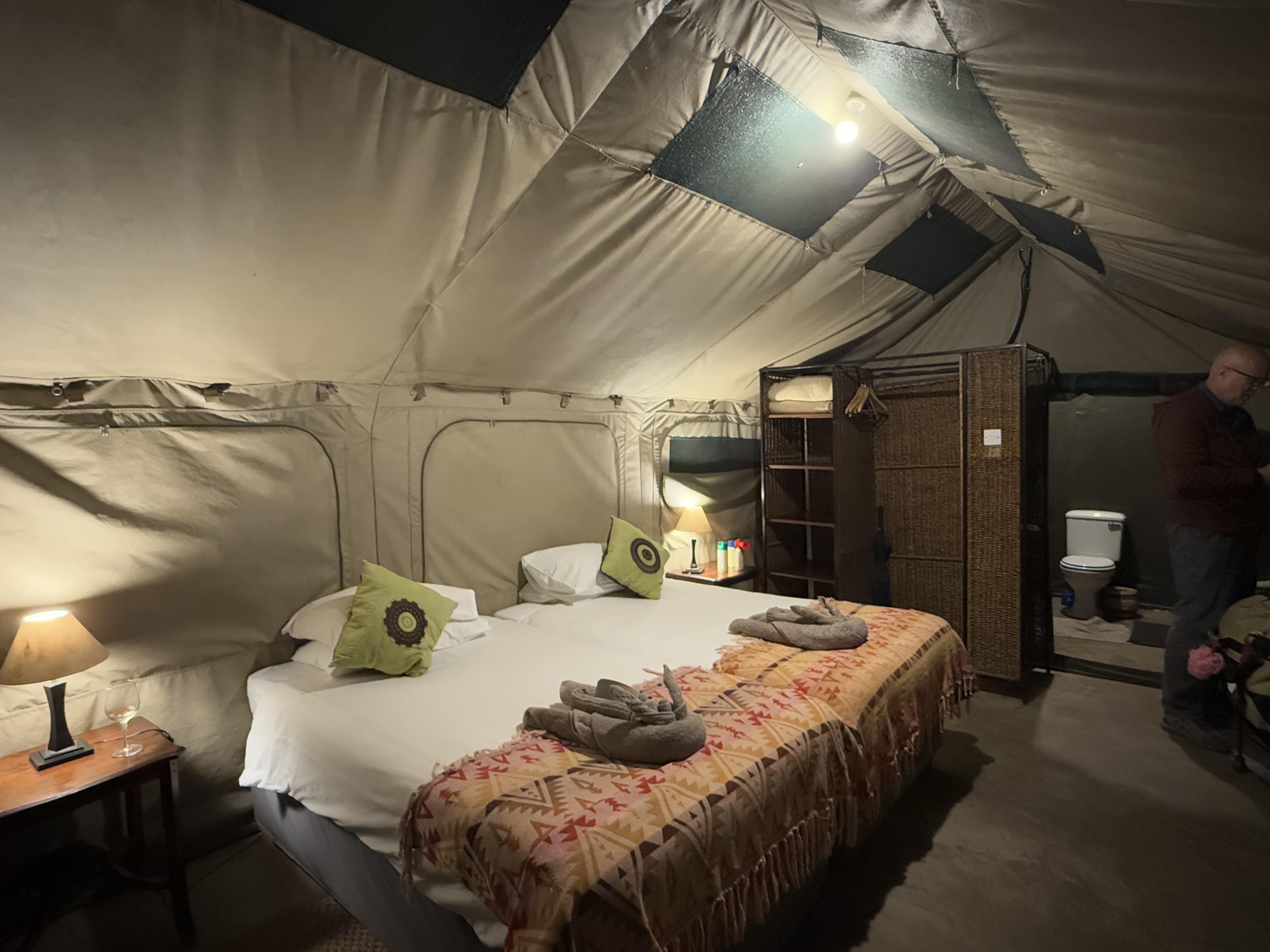 The floors in the tents are concrete or tile. There will be some bugs and spiders that inhabit your tent from time to time, so be prepared for that. Keep slippers and a small flashlight beside the bed for getting up in the middle of the night so you don’t step on something (also check inside the slippers!). The outlets and charging stations are located on the desk and not near the bedside tables. If you need your phone or other electrical items such as a CPAP near you at night, you will need a very long extension cord, which we packed. You will also need a Universal Outlet Adapter for this trip, as well as a Type M outlet adapter, and possibly a type D. We had all three, but didn’t need the Type D in our camps. Some of the camps had standard US Type A and B outlets on a multiplug cord, some had universal outlets, some had European Type C outlets on a multiplug, and some had Type M plugs in the wall. Most had a combination of these. Come prepared.  See our article on outlet adapters here.