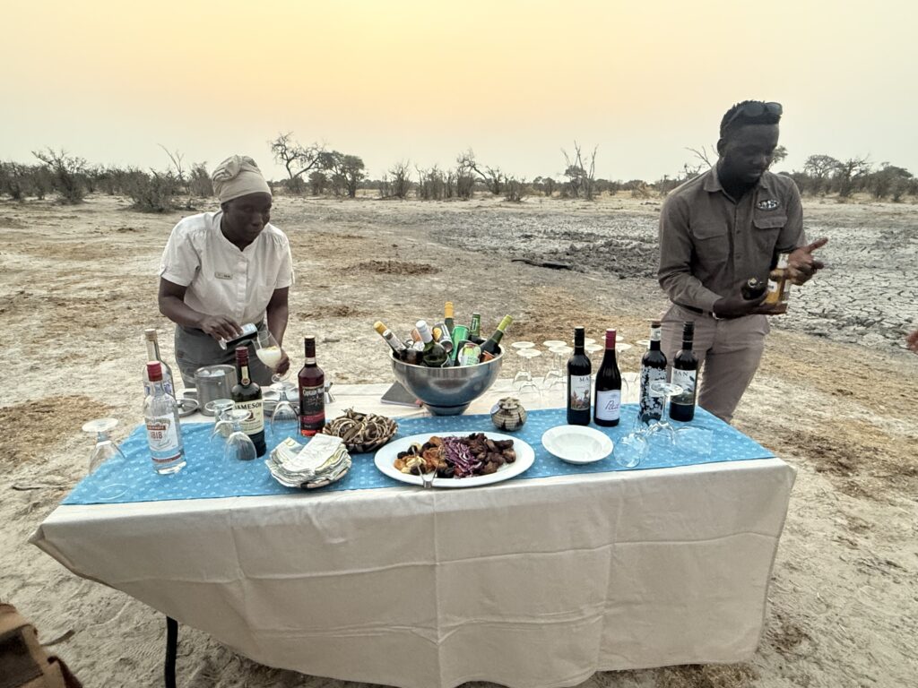 In the afternoon, our TEL Wonder, gave a very informative talk on Zimbabwe history and local culture. OAT has a lot of educational offerings such as this, and we really enjoy them. During the afternoon presentations around 4 pm, the camp staff will serve complimentary tea, juice, or iced coffee, and a snack. After the talk, we loaded up for our afternoon/early evening game drive, where we saw lots of elephants, a few skeletons, learned about elephant poop, and had our first sundowners. Sundowners are complimentary drinks served while on the game drives at sunset for beautiful photos. Non-alcoholic drinks are also available. Occasionally, they take your order and pack it specifically for you, other times, there is a variety of drinks from which to choose.