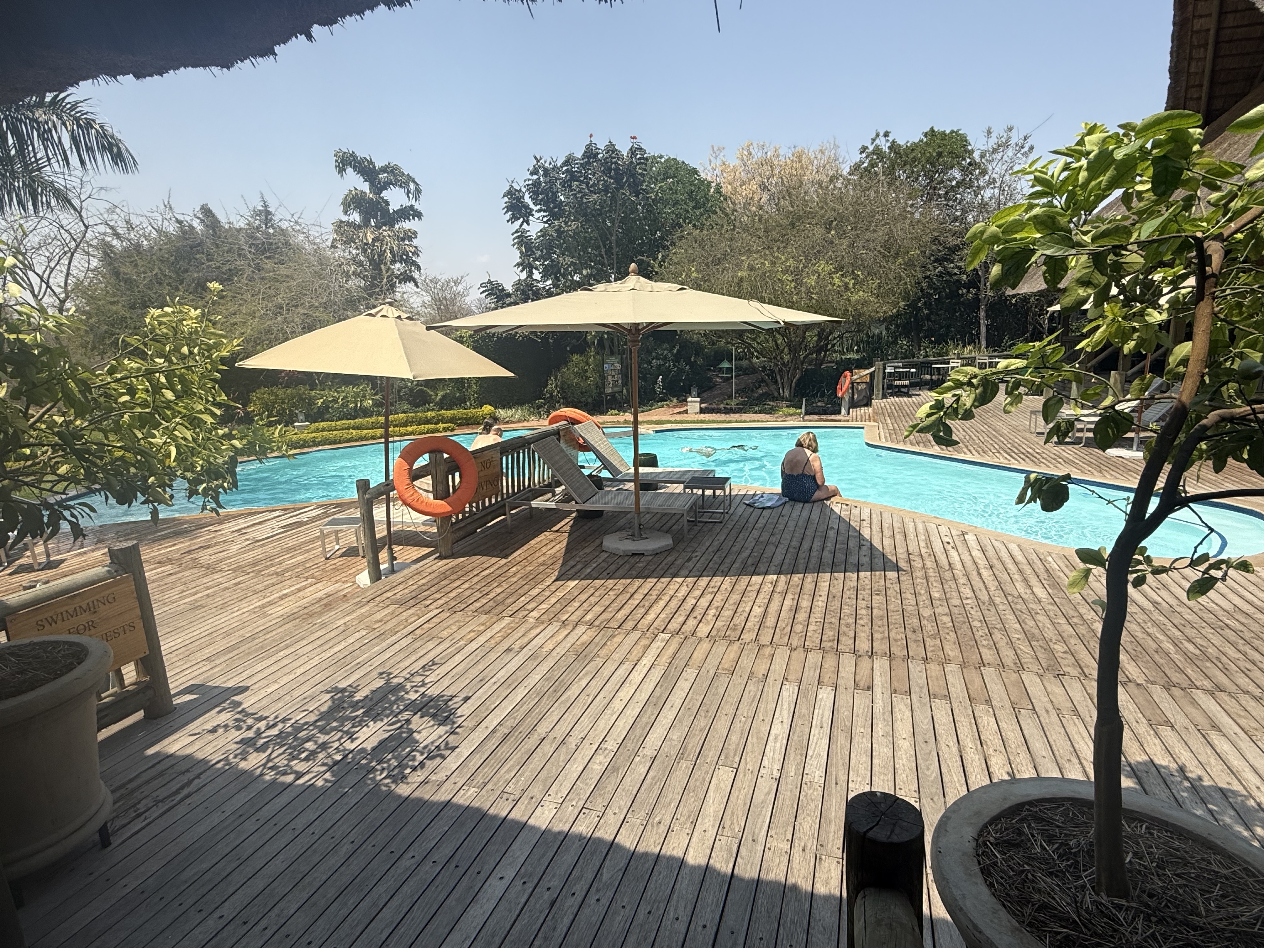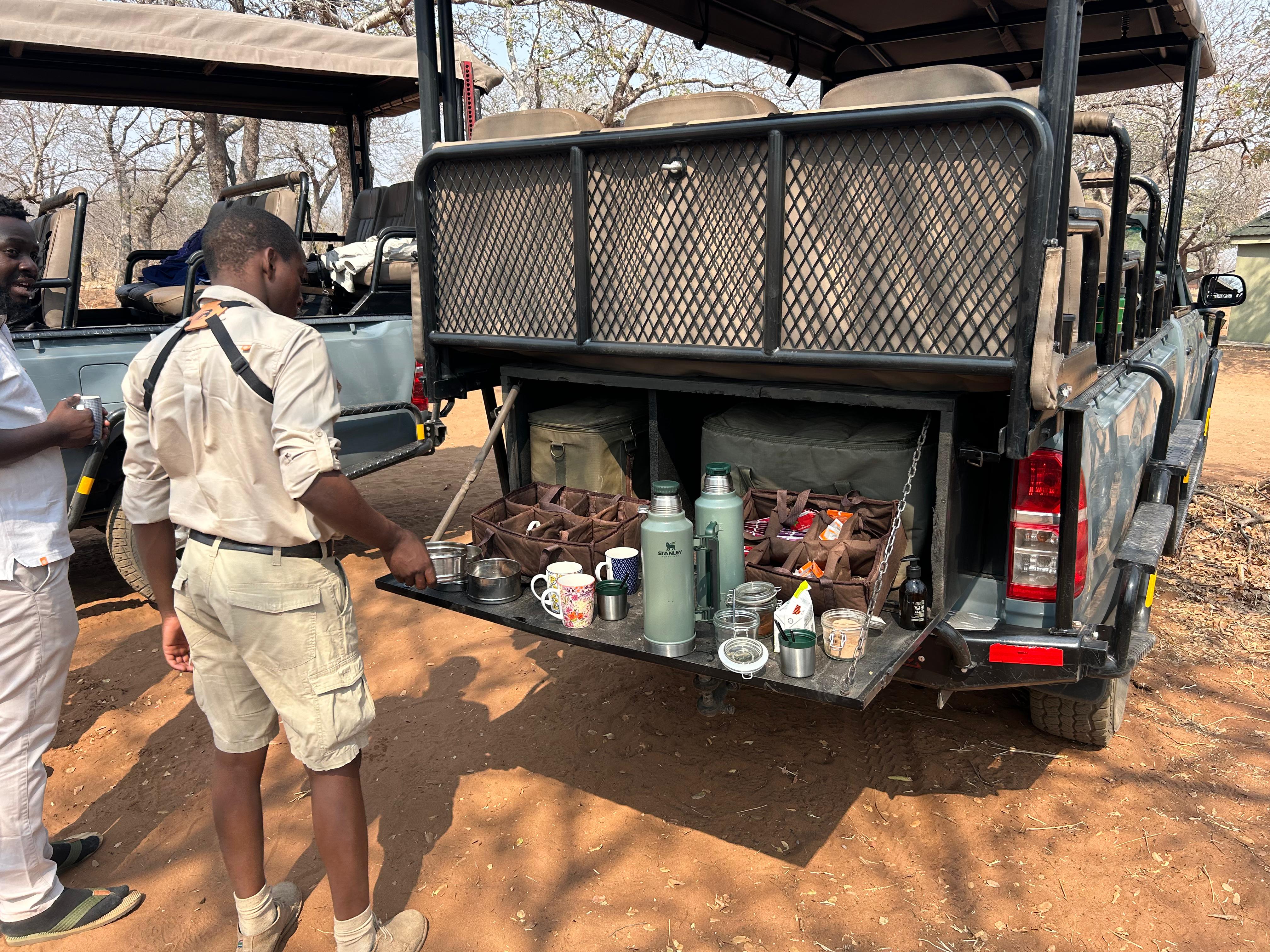 Having a drink and setting off on our drive to Makalolo