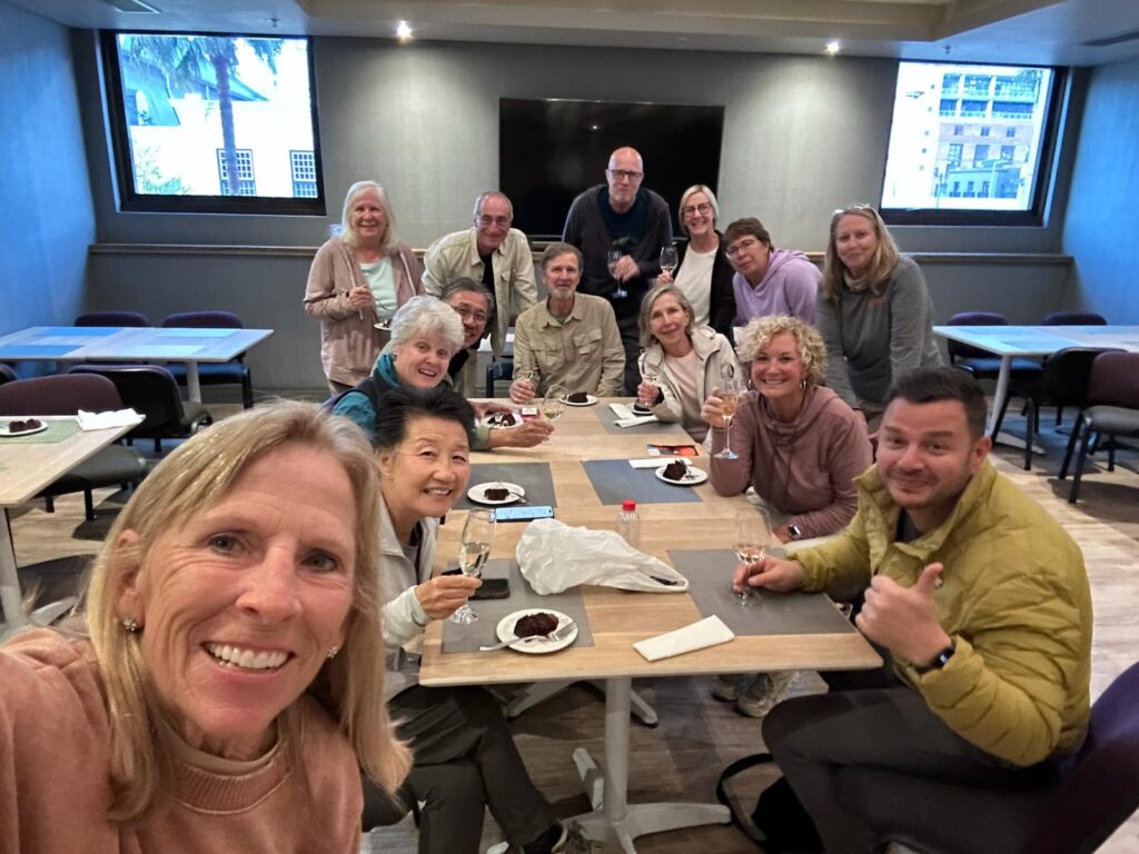 On day three, Tuesday 9/16, we woke to sunny weather so we did the trip up Table Mountain in the gondola. Take a jacket, as it was cold at the top.  Your TEL will secure tickets and take care of the logistics. Day three also included our full day of driving around the entire Cape of Good Hope with a stop at the southwesternmost point of the African continent for photos at the famous sign. There will be several photo stops this day, as well as a stop at the Cape Light House with a trip up the funicular and some free time at the top, a stop in Simon’s Town for the included lunch, and a stop at Boulder’s Beach to see the African Penguins. Lunch on this day was quite late, around 2 pm, as we added Table Mountain on this morning, so plan to take a snack from breakfast if needed. When we returned, we had a birthday celebration at the hotel for one of the members in our group, and Juan arranged cake and Champagne. After our long day, we were quite tired and not at all hungry when it was time for dinner, which is on your own on this day, so we skipped it entirely and went to bed early. Here’s a link to today’s blog post:  https://twotravelover50.com/table-mountain-and-cape-of-good-hope-sept-16-tuesday/