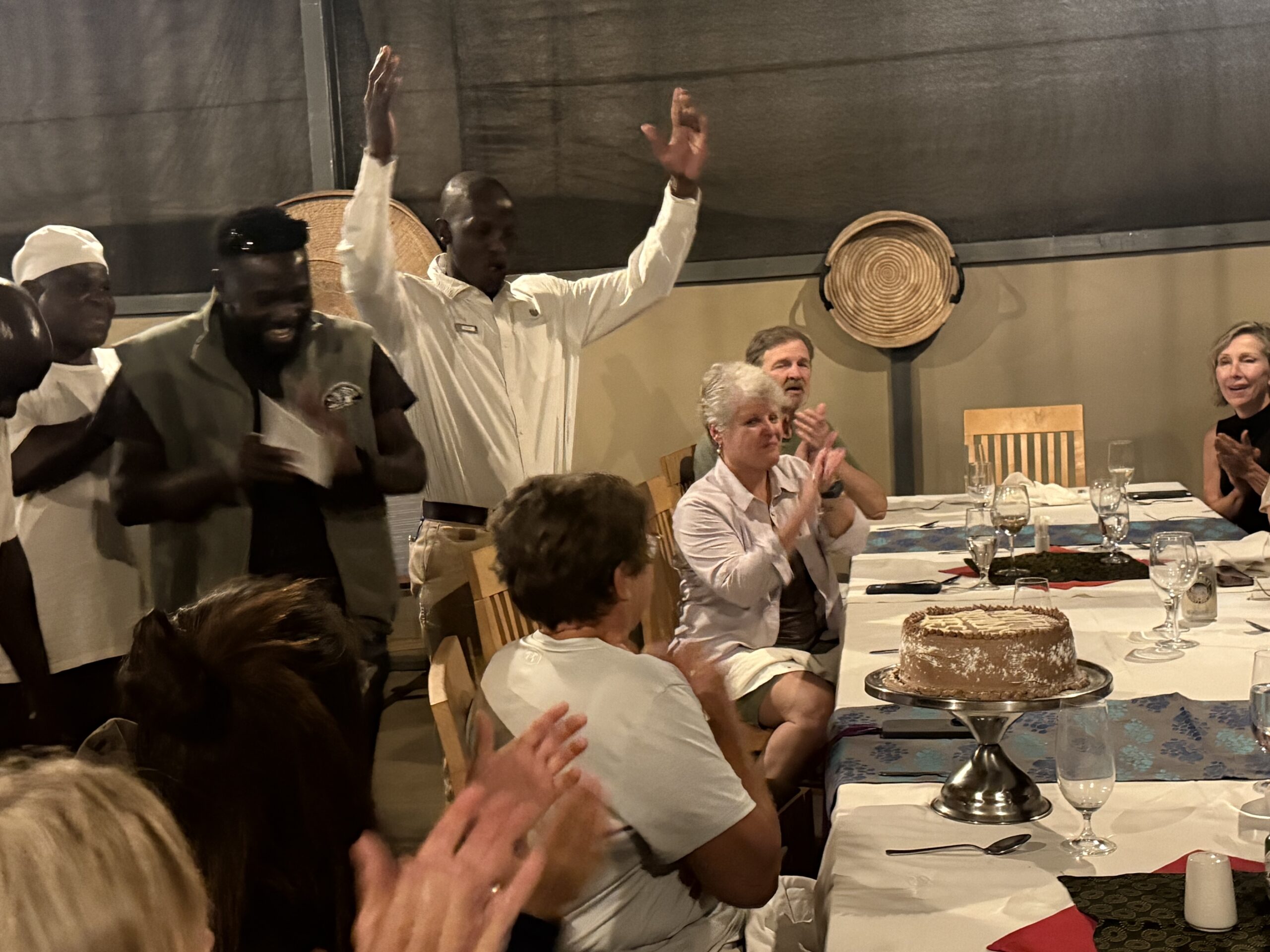 When we returned, the camp staff had a beautiful dinner set up outside for us. The camp staff work so very hard to make your trip memorable and enjoyable, and this was no exception. The table was beautifully adorned with lantern light, the service was impeccable, the food was delicious, and the whole meal was just lovely. Today was our guide Ona’s birthday, so we all got to celebrate with him. We are so very appreciative of all the hard working folks we have met on this trip. You will definitely not be disappointed with this trip of a lifetime.  Here’s today’s blog post to read more about lions and leopards: https://twotravelover50.com/welcome-the-okavango-delta/