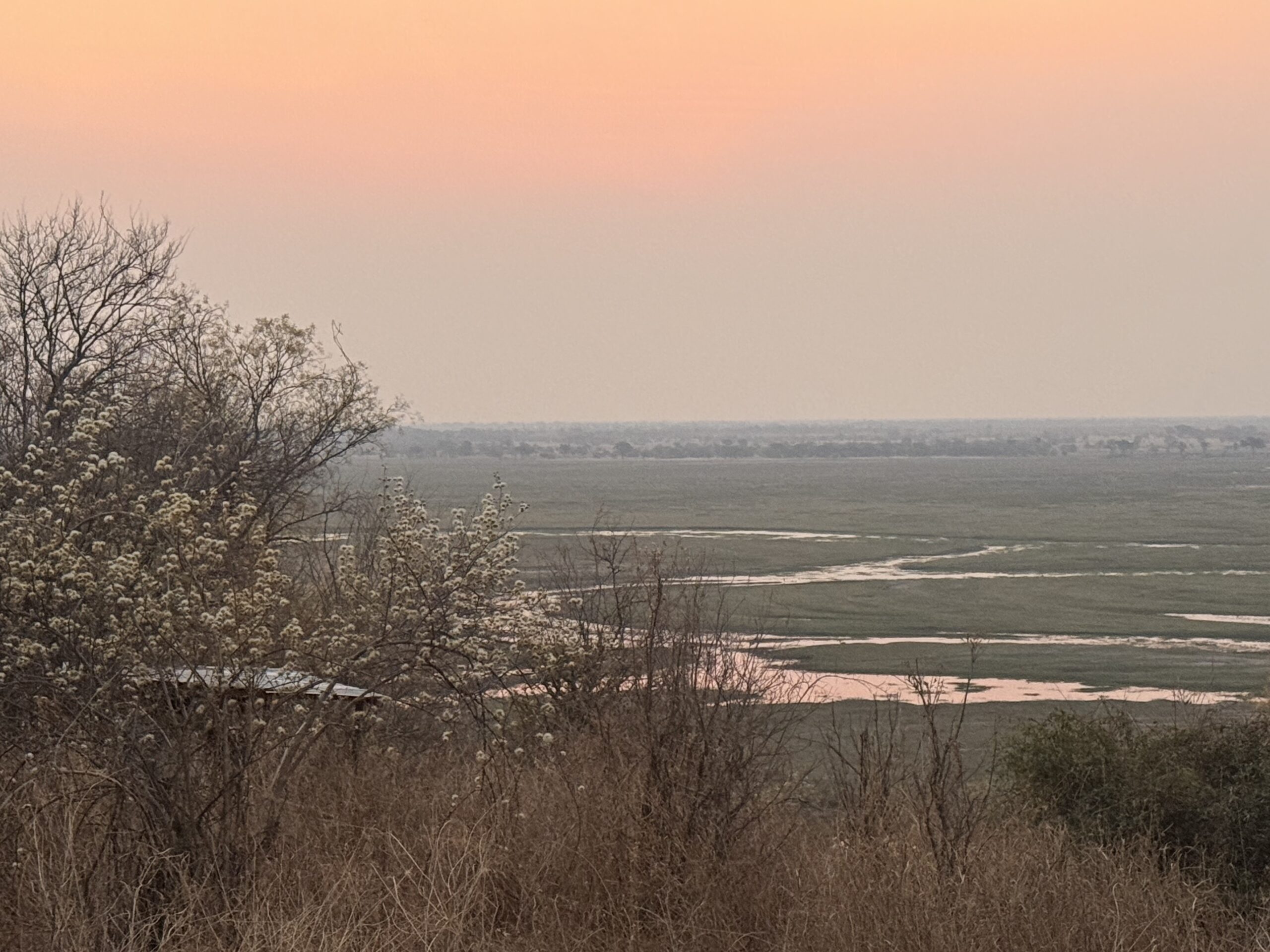 Sunset over the Chobe delta from the lodge; Namibia in distance