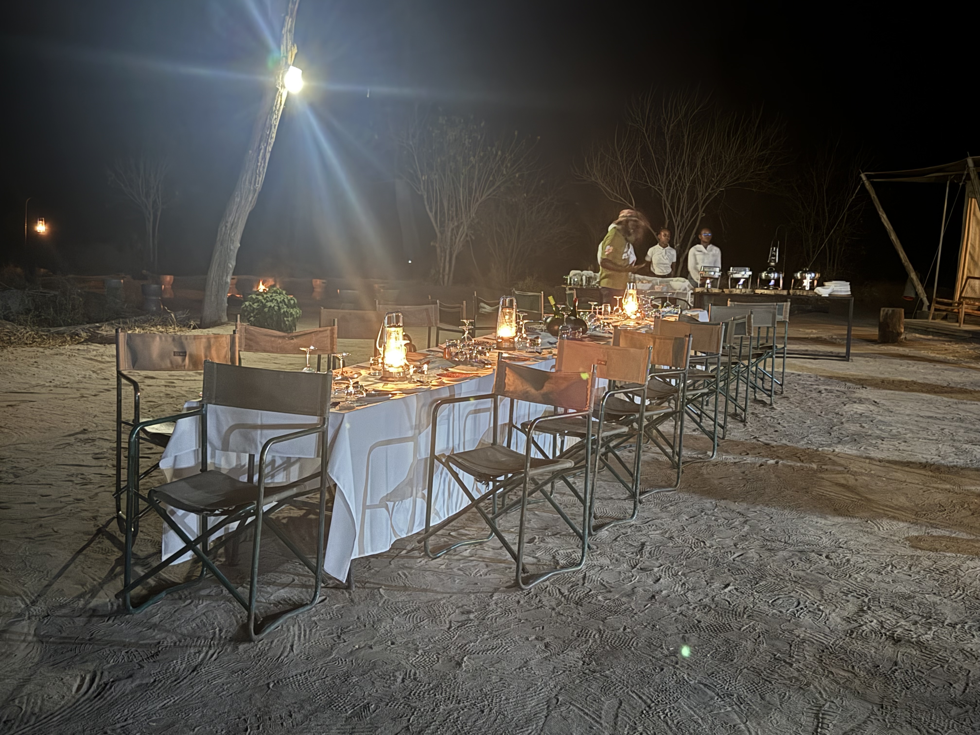 Dinner was waiting for us when we returned to camp. It is usually around 7 or 8 pm by the time you return from the game drive. The service, the chefs, and the food are amazing at all the camps. Meals are served at a beautifully adorned long table that seats everyone, and often the guides, TEL, and camp managers will eat with you for lovely conversations. Food is often locally sourced and you get to try things you’ve never had. If you have any dietary restrictions, the camp staff are happy to help.