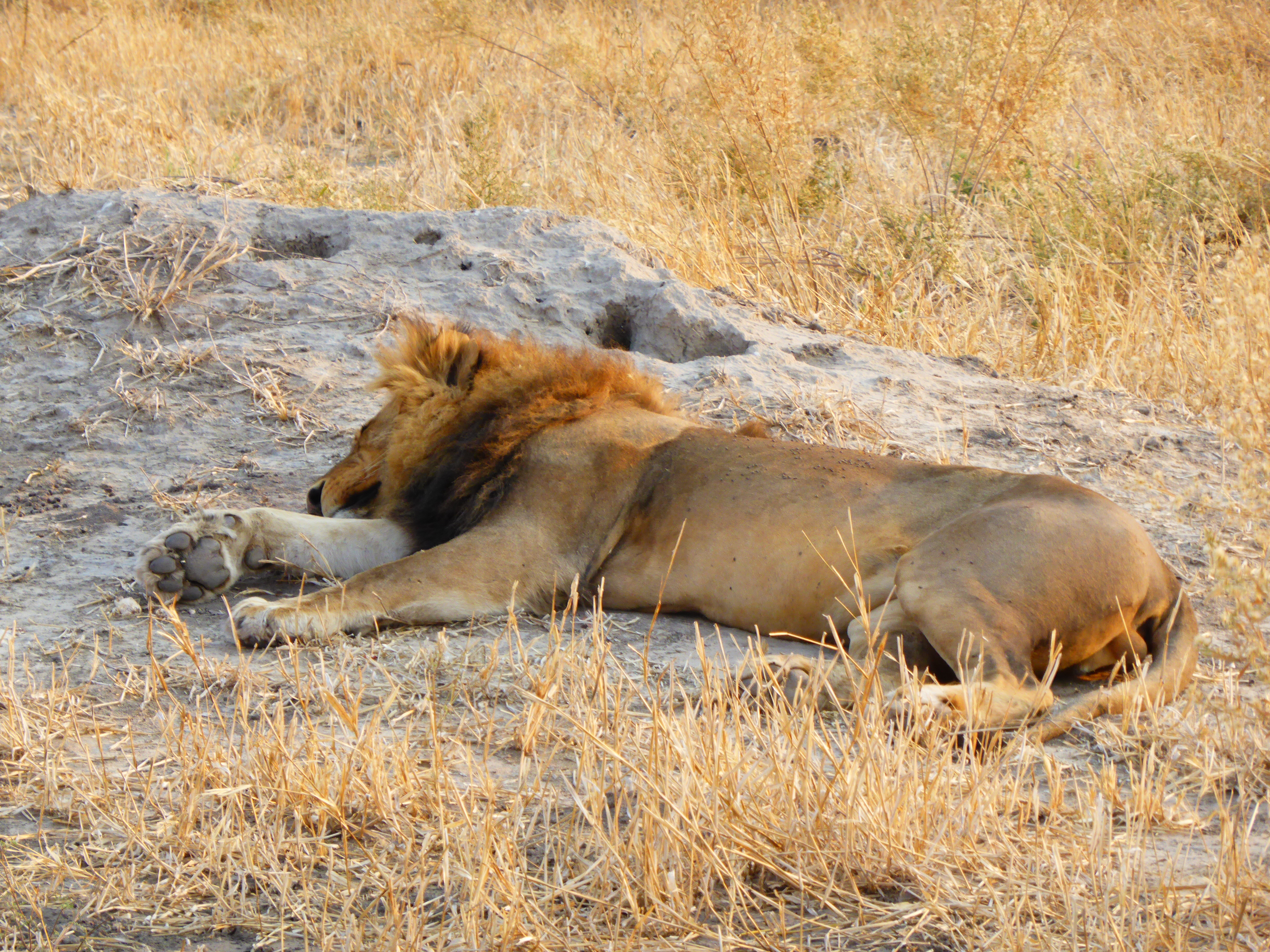 Today started with a lion delay. Each morning, the guides check the camp for tracks and animal activity before walking to each tent to wake you. As mentioned earlier, you will not be allowed to leave your tent in the morning before the wake up call. Today our usual wake up call did not come at the designated time. We were up, as we like to head to the lodge for our coffee the minute we get the call. We immediately knew something was up, and we had heard heavy lion activity most of the night. So they guides came to the tents in the trucks to pick us up. They explained the lions had been roaming the camp all night and were still close by, so it was not safe for us to be walking to the lodge on our own, especially those of us they kept putting in the farthest tents. 😉 I think I failed to mention, we were back to having the longest walk at this camp, tent #10! However, don’t be fooled by thinking #1 is the closest, as this camp is split with five tents on one side of the lodge and five tents on the other! Gotta get those steps in! When we headed out on our early morning game drive, we found two of the large male lions quite close to the camp, one resting on a termite mound, and one resting under a tree, on opposite sides of the camp. They had us surrounded for the kill, apparently.
