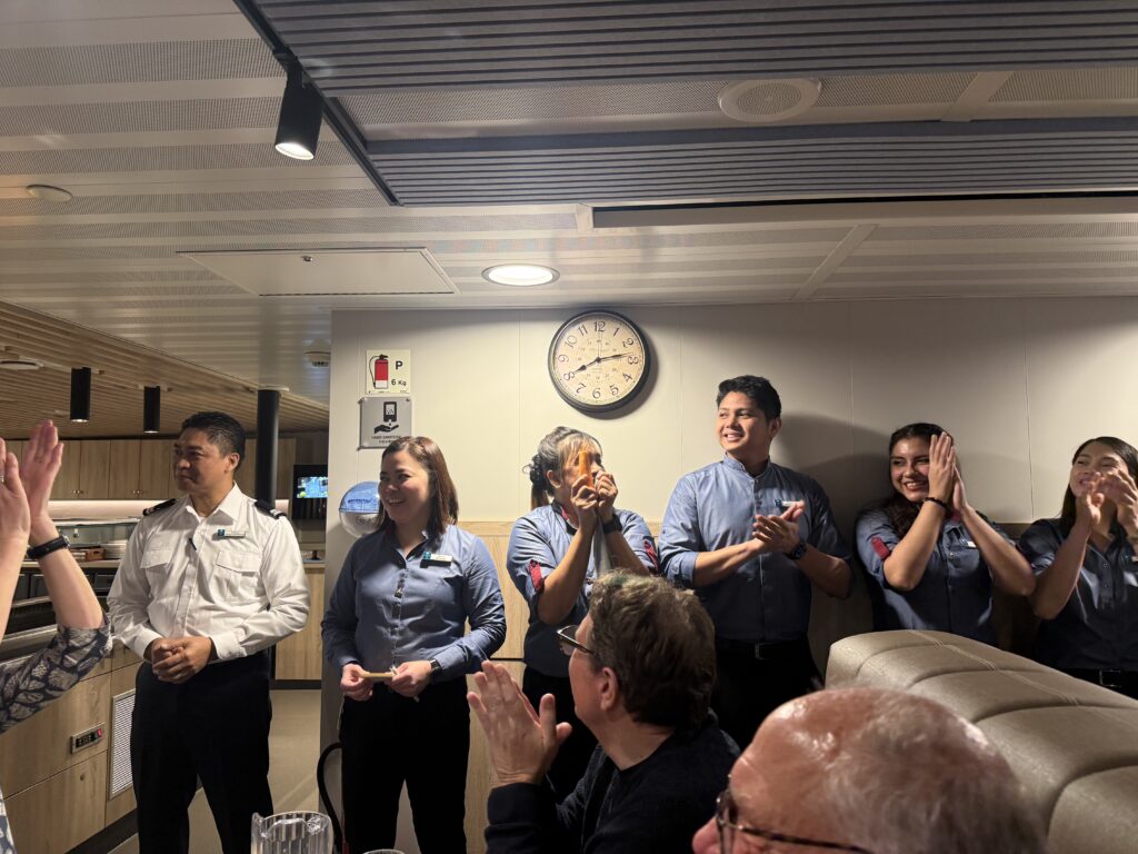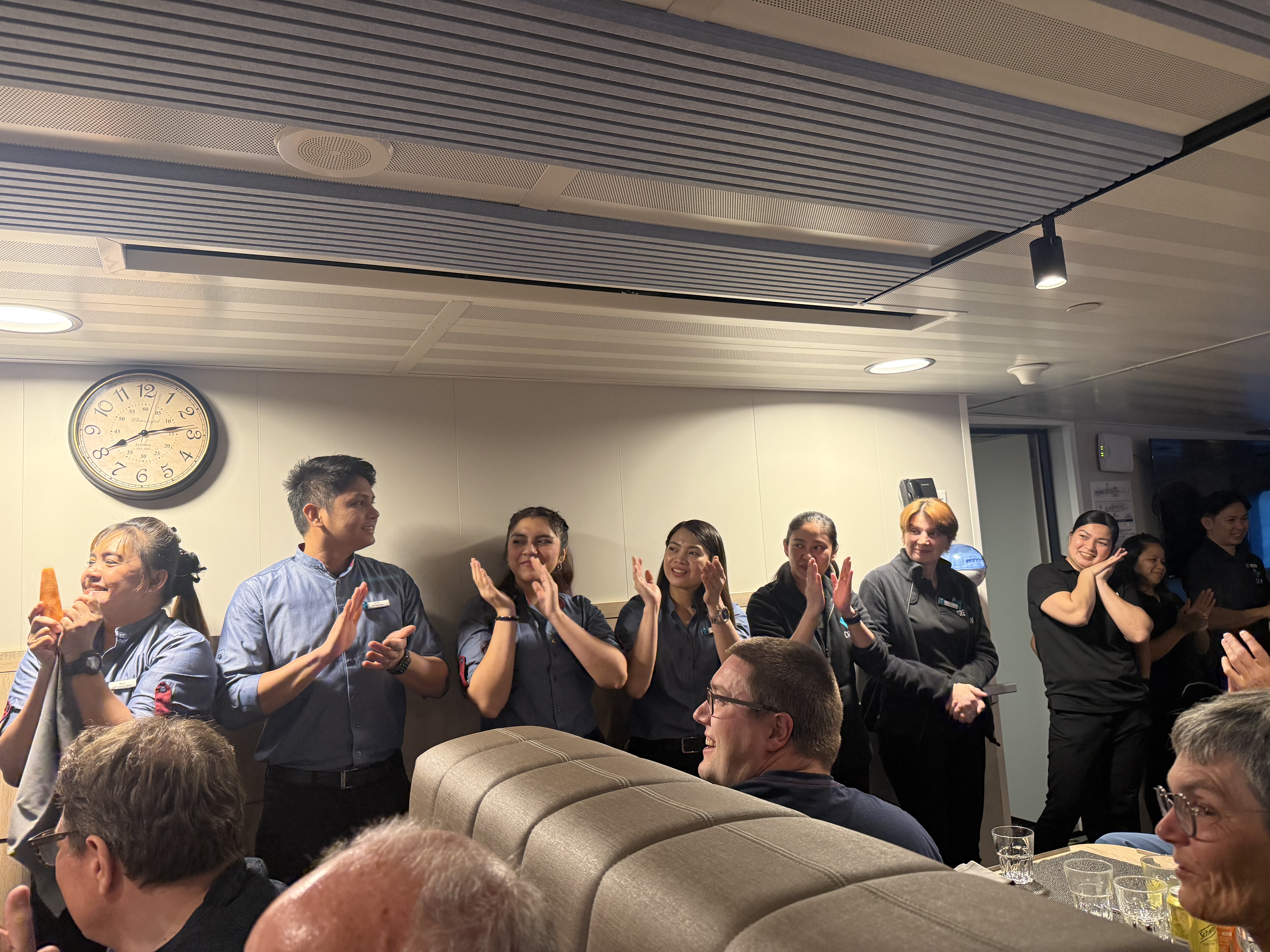 Dinner was a fun affair, as we got to finally see and meet all the crew that work behind the scenes. We were also treated to another birthday celebration, one of 11 on this sailing, as the dining room team partied their way around the room to the birthday person. You could not hide if you had a birthday on this ship; they had our passports, so they knew who we were. It was actually a lot of fun. That dining room crew, as well as all the crew, were super hard working and amazing people. Like most cruise ship crew, they acted like we were the one and only sailing they had all season. They knew our names and cabin numbers from day one, and promptly prepared our Aperol Spritzes and Gin and Tonics without our asking when they saw us walk into the bar.