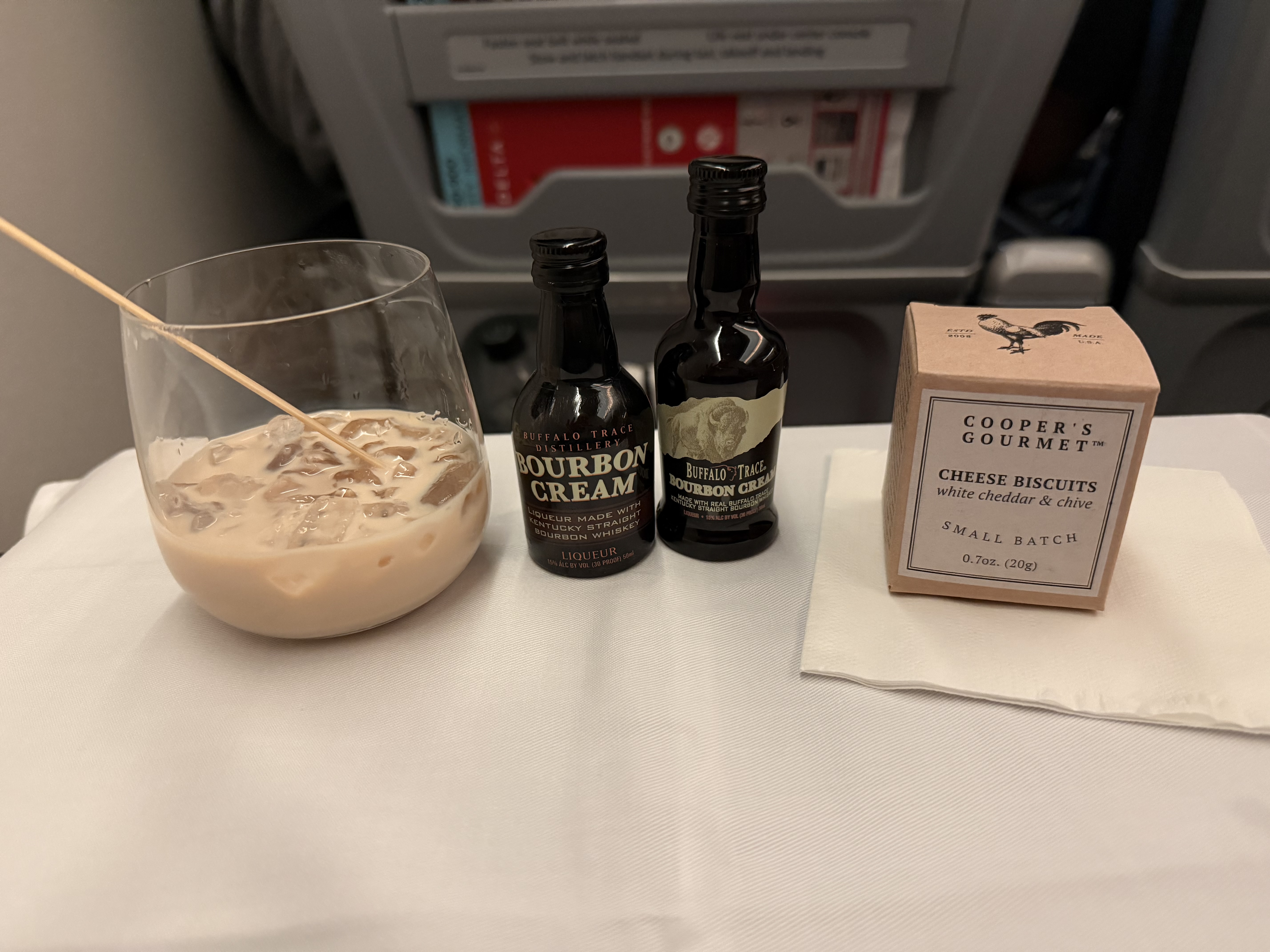 We left the gate at 10 pm, right on time. They immediately came around with the drink cart and I had some bourbon cream over ice. It comes in the cutest little bottles. It was delicious. Delta is semi-famous for their bourbon cream, which is actually Buffalo Trace’s, but they rent enough of it to keep the passengers happy.