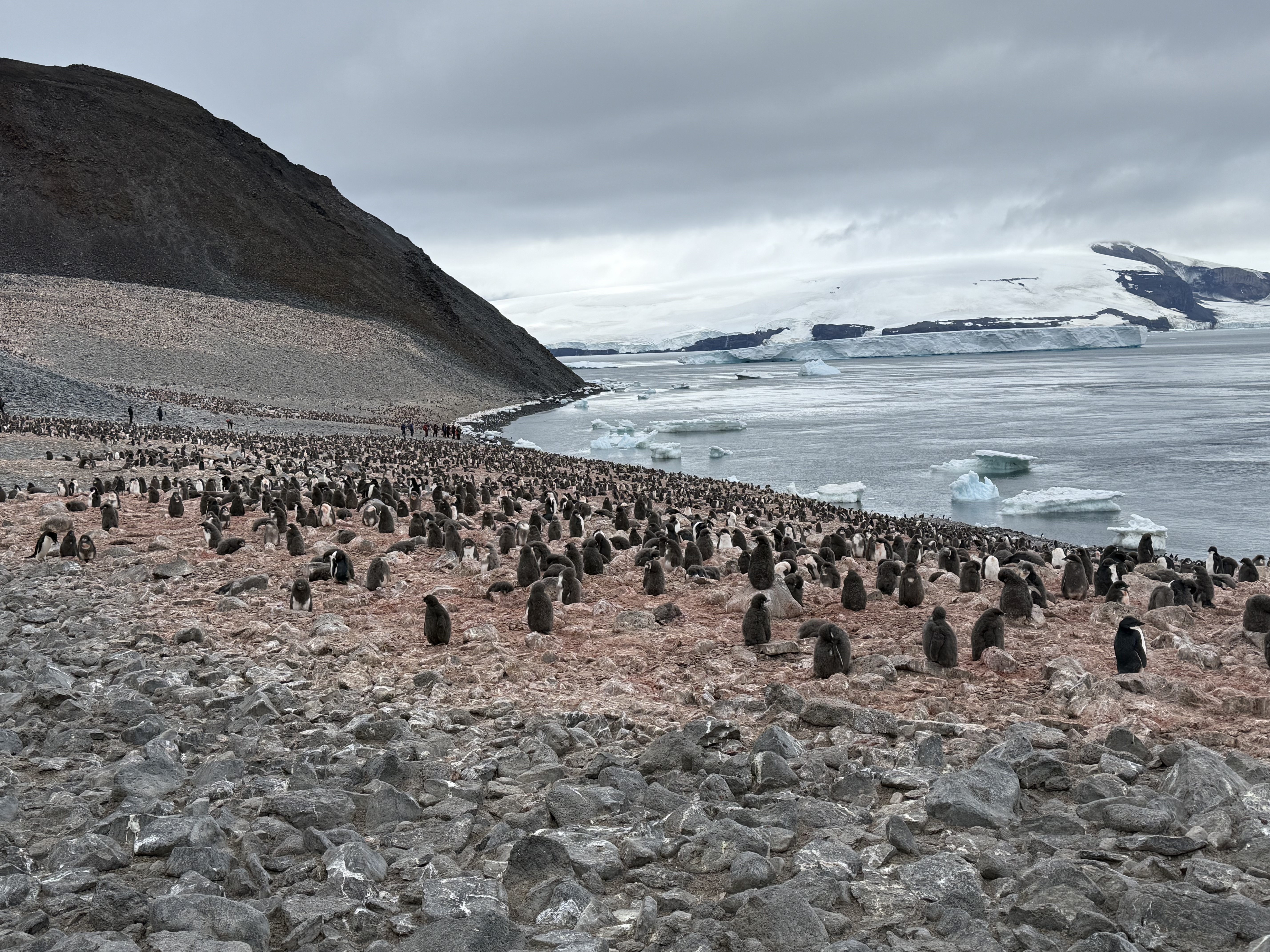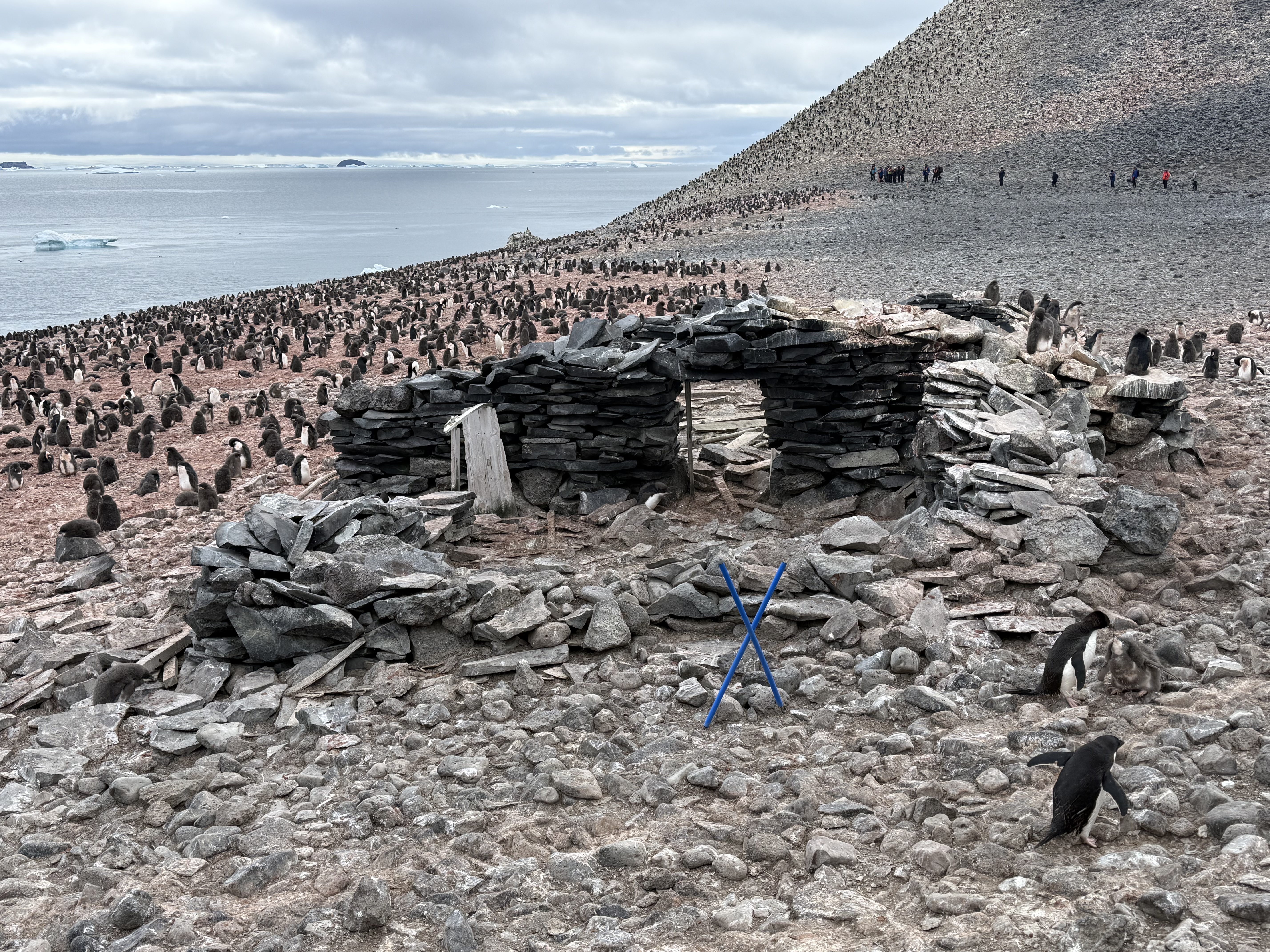On Monday we visited Paulet Island where we saw and smelled the stinkiest Adelie Penguin colony in the entire Antarctic area. Good lord! If you want pristine white snow and mating Adelies, come in October. If you want baby Adelie chicks, come in December. But if you want super stink that permeates your clothing, and you want to smell it in your cabin the next day, definitely come in February, when the chicks are molting and poop has soaked the snow and turned it pink. Their diet is strictly krill, hence the pink colored poop. Not sure it smelled that bad when they ate it. The penguins only come on land to mate and have chicks, then they spend the rest of their lives at sea, and floating on an occasional iceberg. On the bright side, we also got to see the remains of the Norwegian expedition’s cabin where they spent the winter back in 1902.