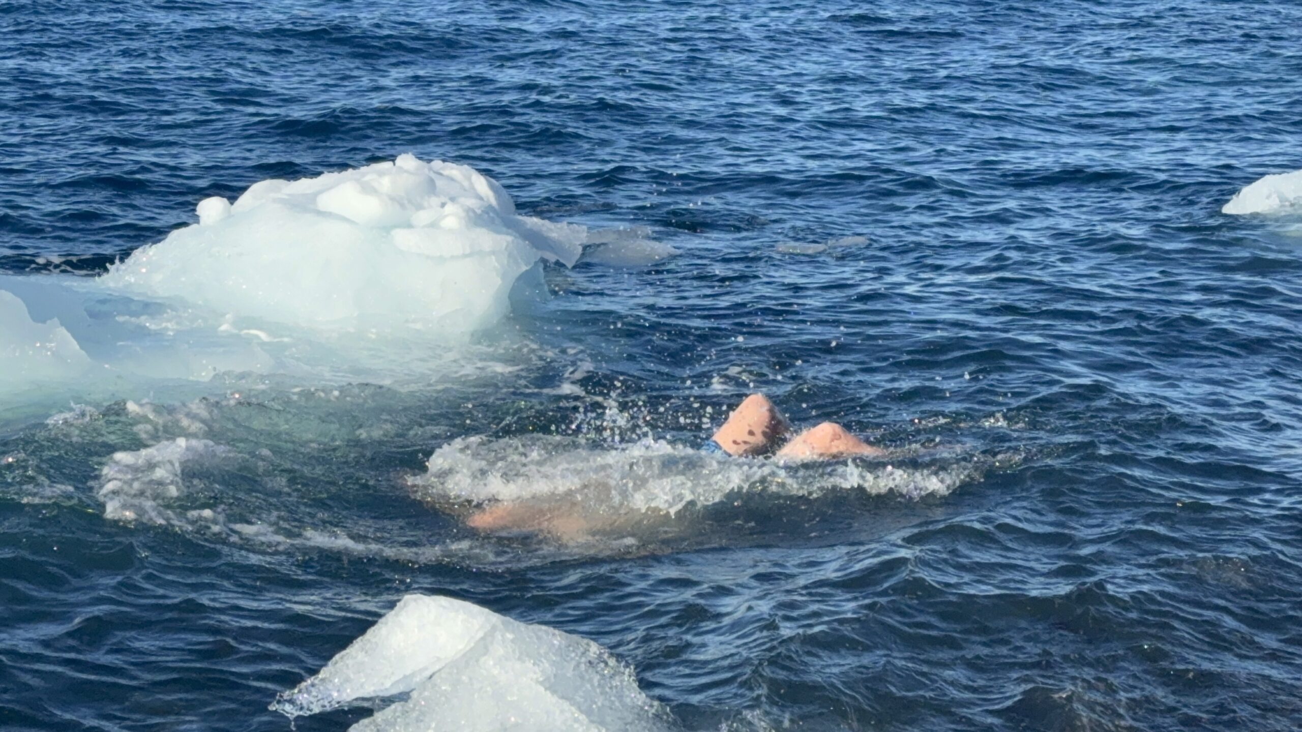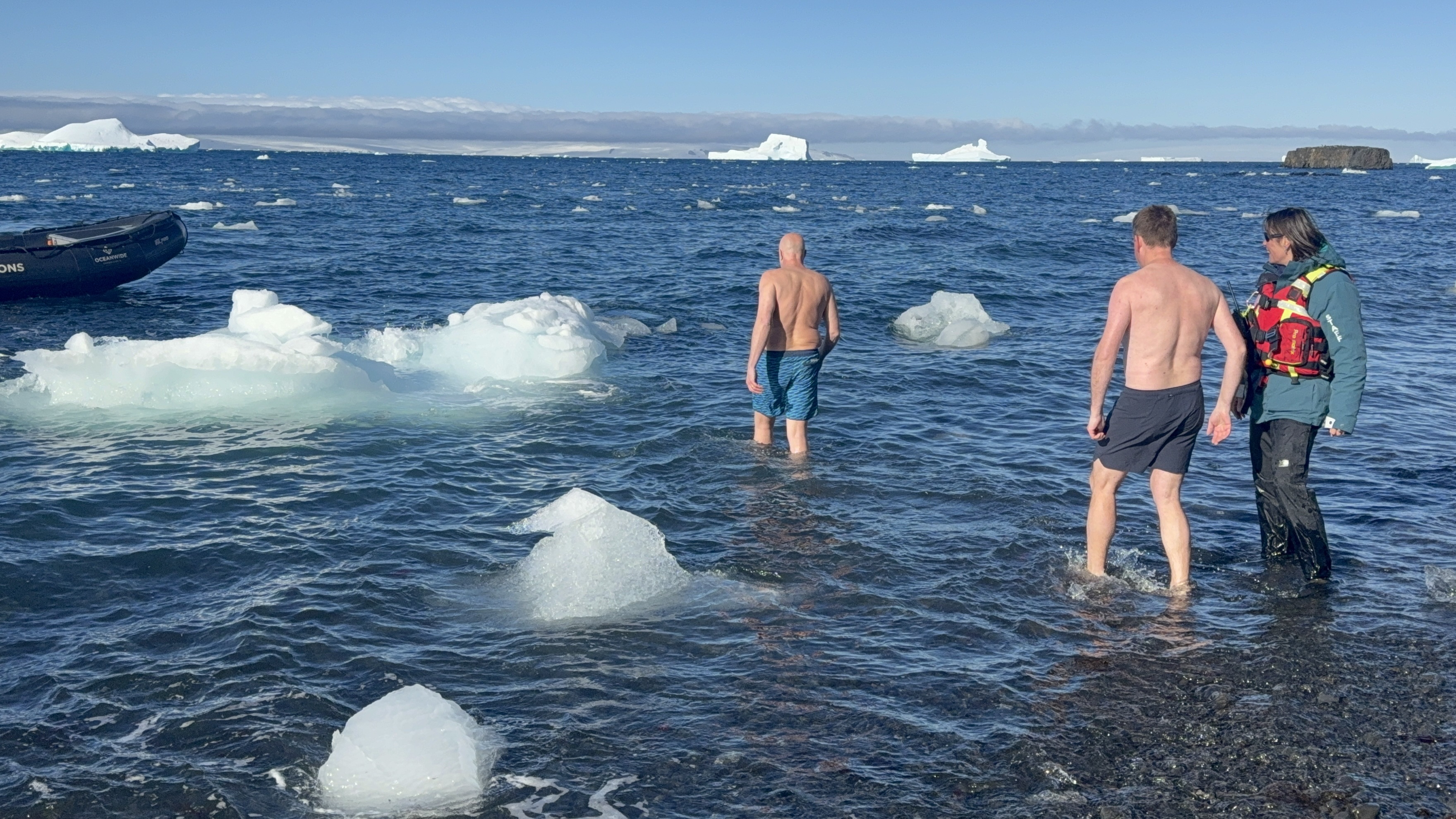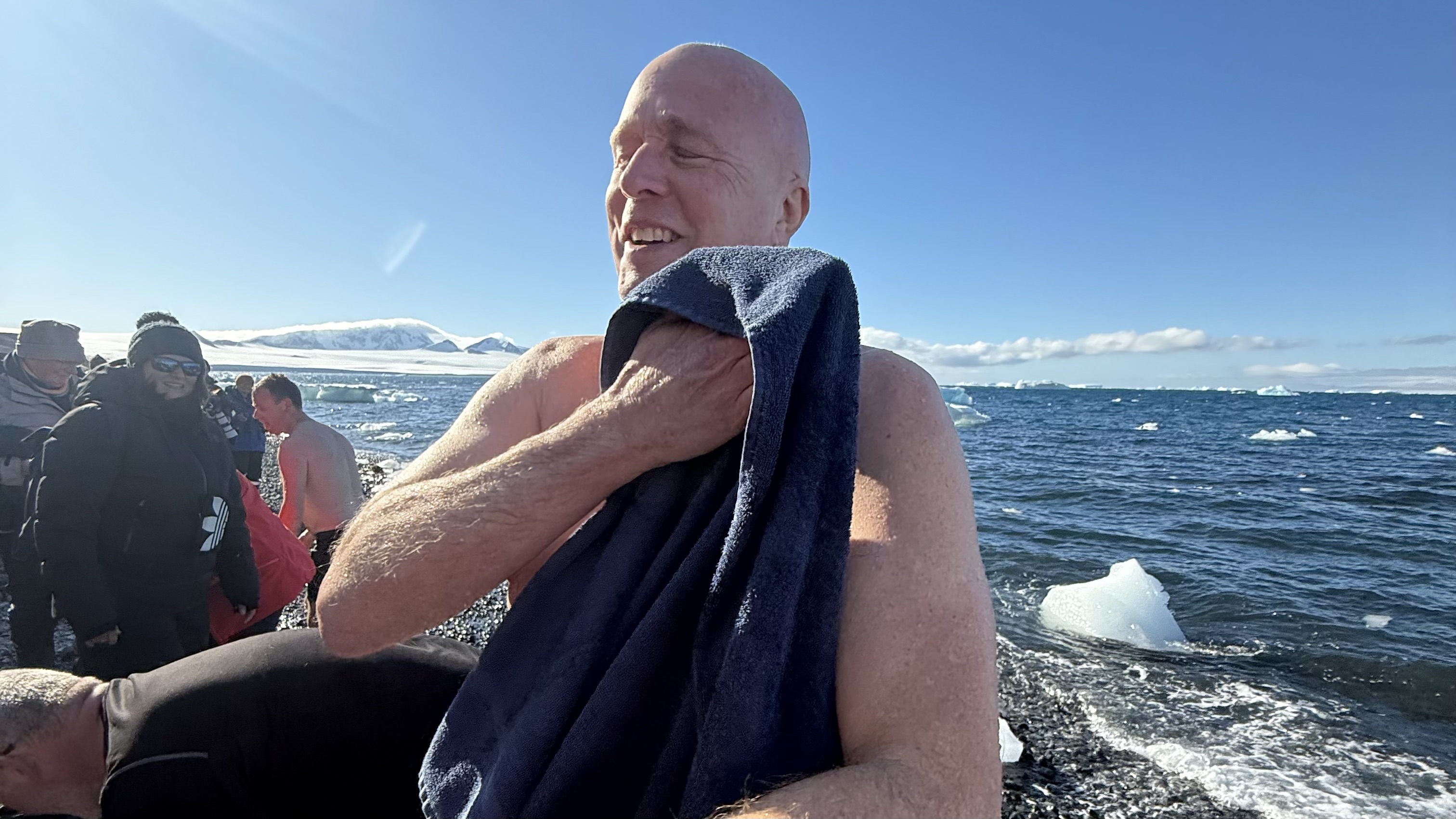 Steve, along with quite a few others, also participated in the polar plunge. On the Plancius, they don’t do the polar plunge by jumping off the ship, as some ships do. Instead, you walk into the water from the shore. The guides claimed that you haven’t really done a polar plunge unless your head is under the water, so he made sure to do it right! He said the water was super cold, but that he wasn’t as cold as he thought he would be when he got out. He did get a priority Zodiac ride back to ship afterwards.