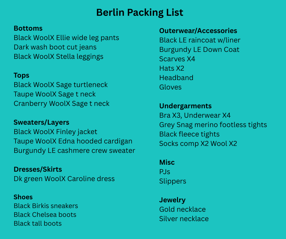 So that’s what I packed. If we had to do it over again, we would definitely have packed warmer coats, so heed our advice if you are planning a cold weather trip to Berlin! There is so much to see, do, and learn about, and it is definitely worth a trip, even in the cold.