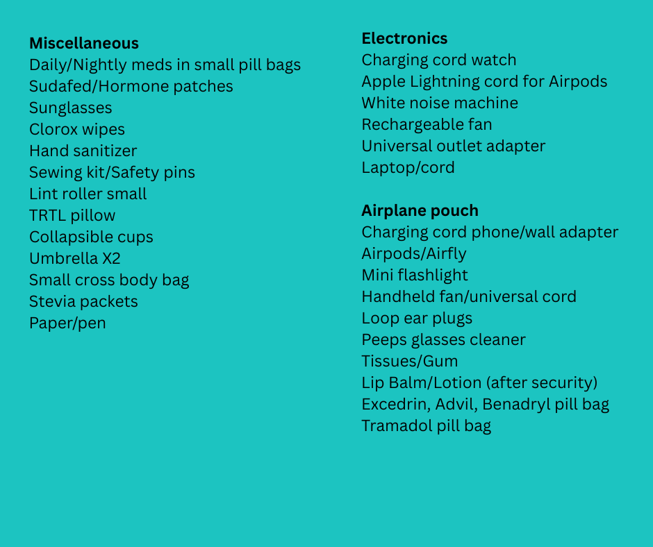 For the trip back, I checked my bag, and carried my backpack and my crossbody bag onto the airplane. I pared down and decanted my liquids, and took only what I needed. For more advice on packing liquids for carry on travel, please see my article here. I packed my down coat into a gallon size zip lock bag to keep it compressed. I find zip locks work better than any compression packing cubes I have ever tried.
