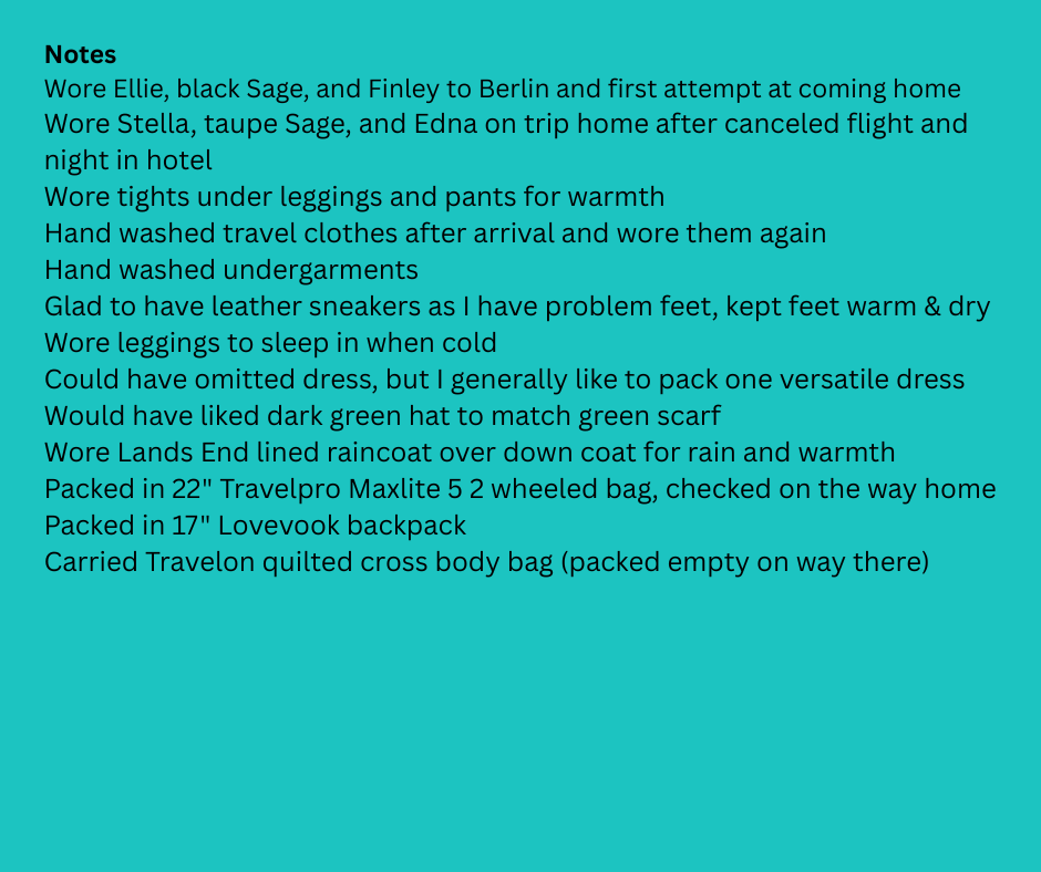 I tend to pack fairly light and not check my bag. I usually pack three complete outfits as a starting point for most trips then add from there as needed. One complete outfit is a bottom, a top, and a layer such as a cardi, a crew neck sweater, or lightweight hoodie or jacket. I also try to pack in a capsule wardrobe with items in similar colors that can be mixed and coordinated to change up the looks. I start with two base colors for pants, such as black and navy, then add coordinating colors such as burgundy and taupe. For this trip, I packed three bottoms, three tops (all Merino wool turtlenecks), and three layers (all Merino or cashmere), and all were able to be mixed and matched. I also added one Merino wool sweater dress for a couple of nicer dinners. The collages represent all the clothing pieces I packed, and some of the ways I wore them. I also brought a couple of scarves and hats to change up the look for photos, since you will be wearing a coat in most of your photos. The complete list is at the bottom of this article. For more advice on packing in a carry on for most trips, see this article.