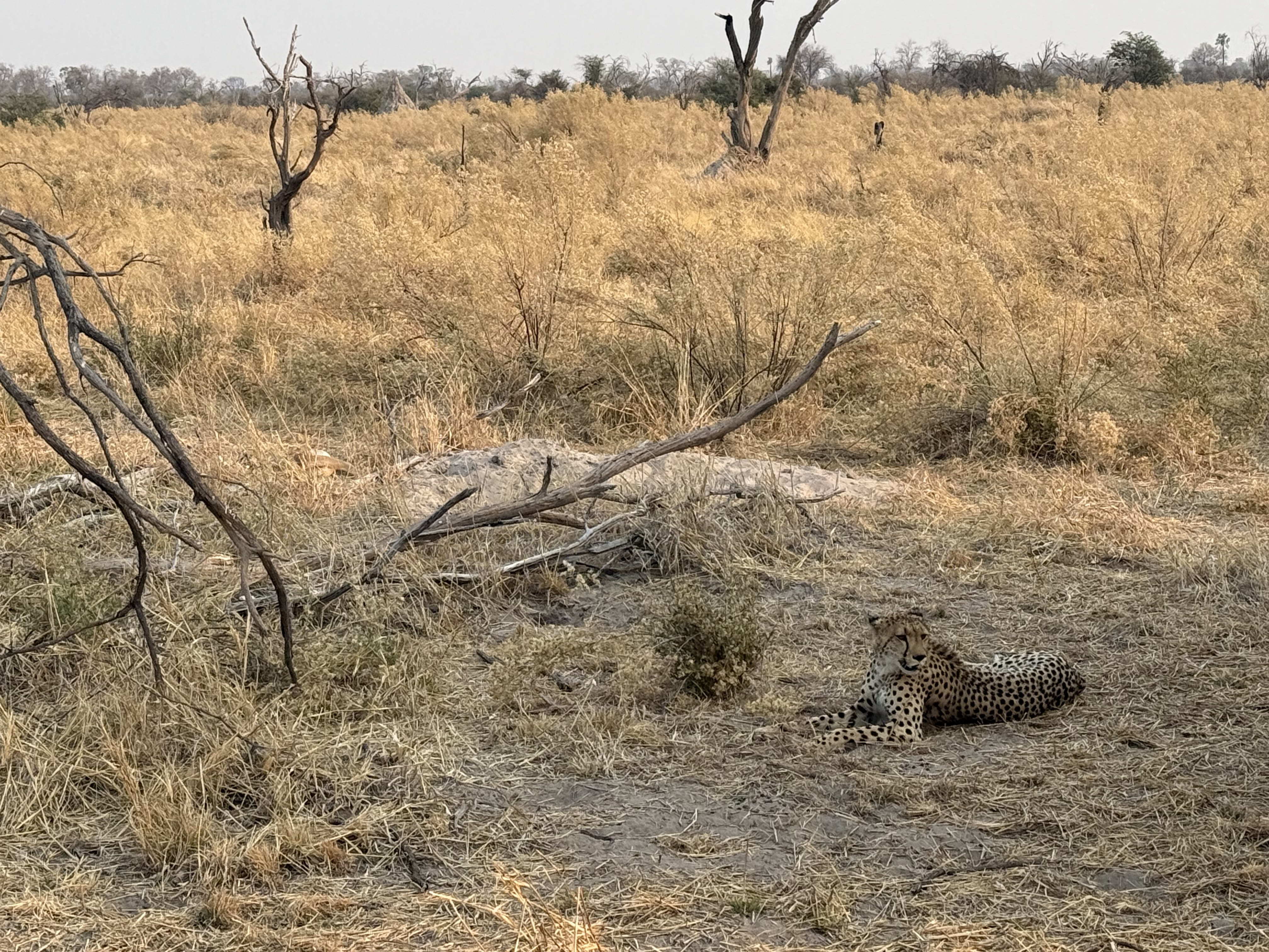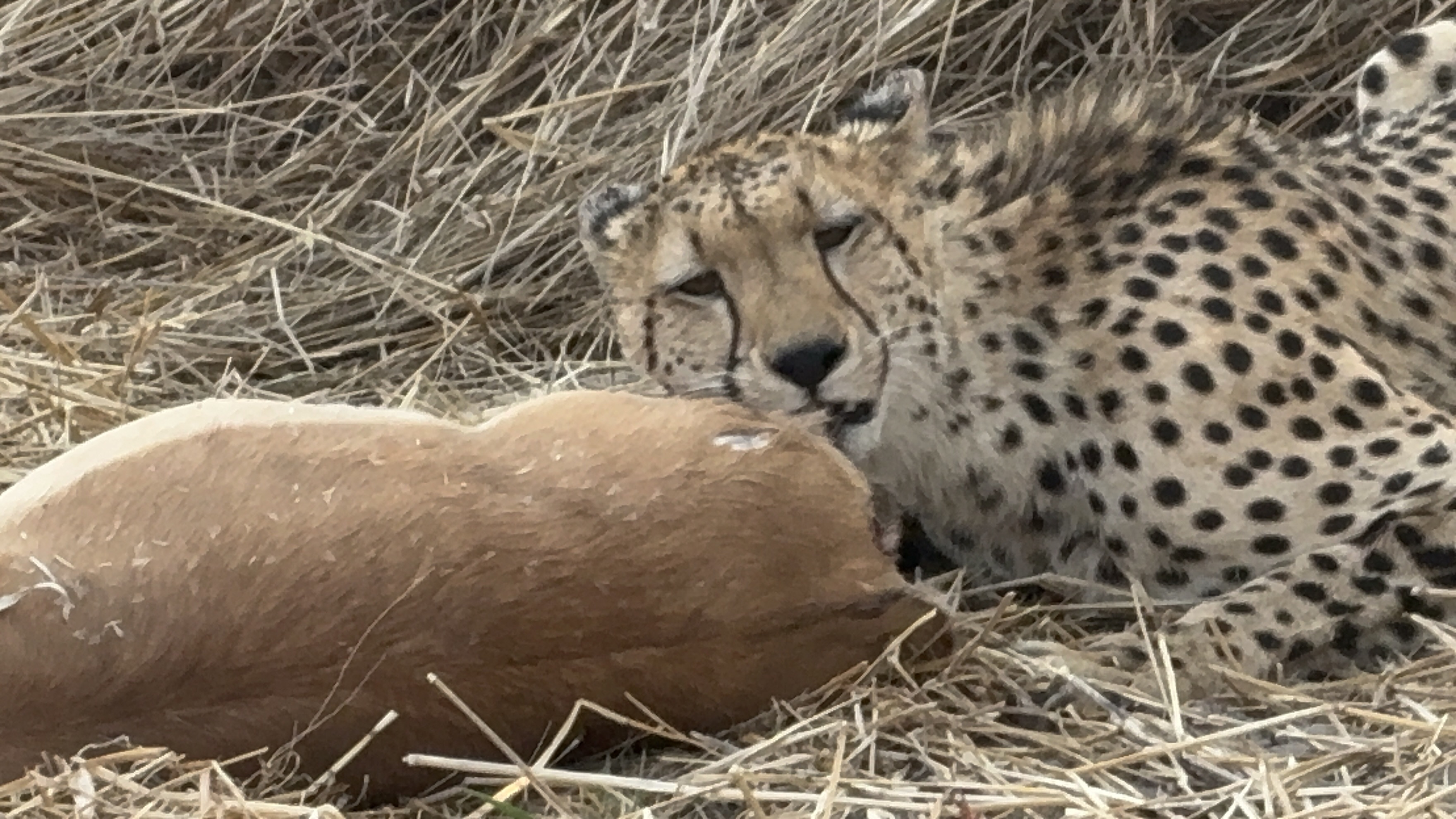Today was the day of the cats! We started out with an early morning game drive where our expert guide and tracker Ona stared seeing signs he recognized. First we saw a small herd of Impala running not too far away from us. Then he heard the sound of the Francolins (a bird that sort of resembles a quail) in distress. So he followed the sound of the birds straight to a young female cheetah resting under a bush and panting heavily. Our first cheetah sighting! Steve noticed she had blood on her chin and on one of her murder mittens, and then we saw the dead impala just a few feet away. She had just made the kill and was resting up and catching her breath before she started feeding on it. We watched as she got up and dragged the kill into the bush and started tearing at it. She nibbled on it for a few minutes then took another break as we watched. We decided to move on and come back later on the way back to the camp. As we pulled away, I couldn’t help but tear up as I was just overcome with emotion. (In my defense, I’m a huge empath and I cry at Hallmark commercials.) We are in one of the most beautiful places on this earth, and this young cheetah had been gracious enough to give us a glimpse into her world. All of this was thanks to our incredibly knowledgeable and talented expert guide who clearly loved his job and was thrilled to share this with us. It was amazing, and that word doesn’t even do it justice. (In the photo, if you look between the two branches to her right that form a wide V or L shape, you will see the brown impala with a white belly.)