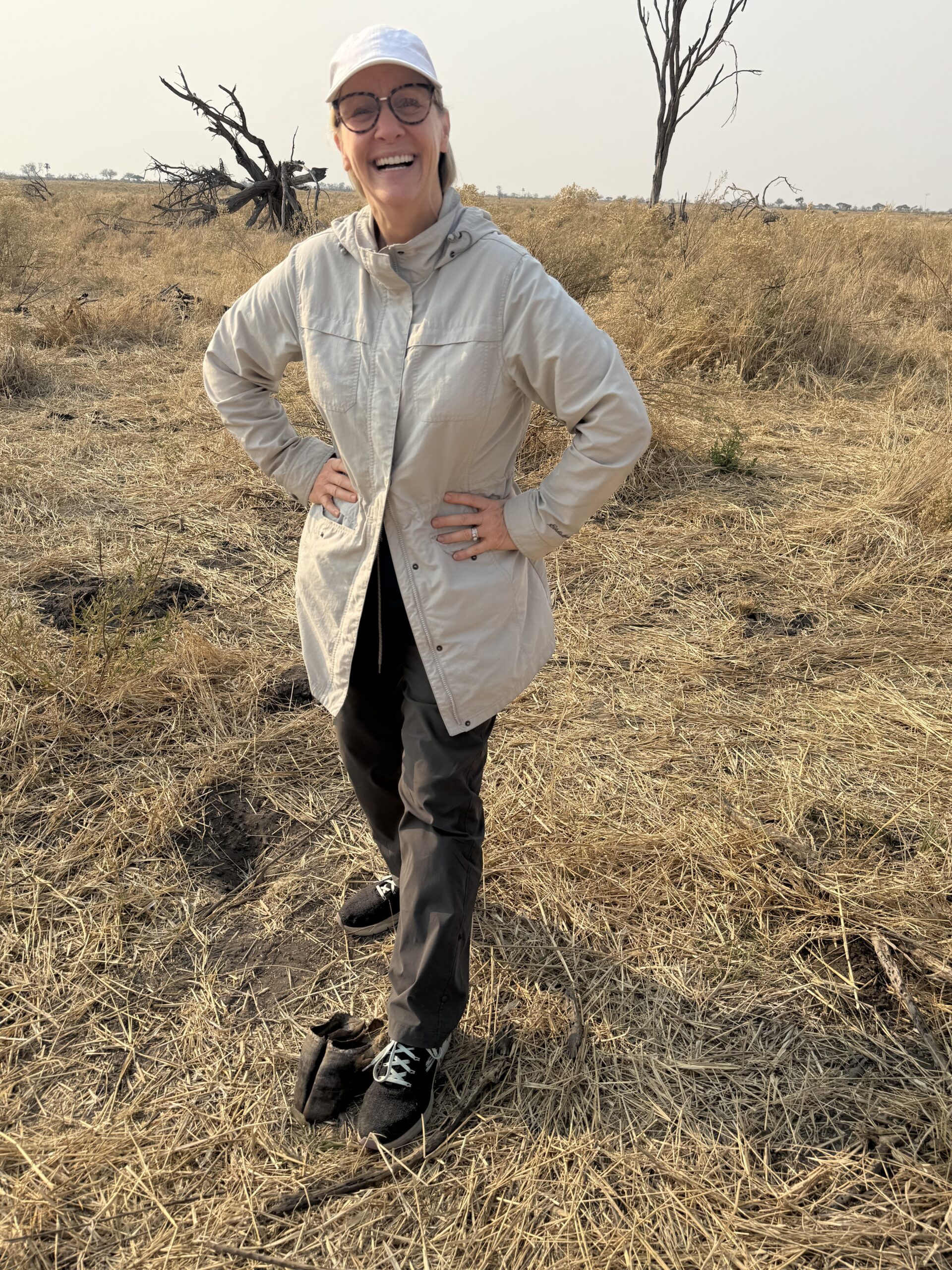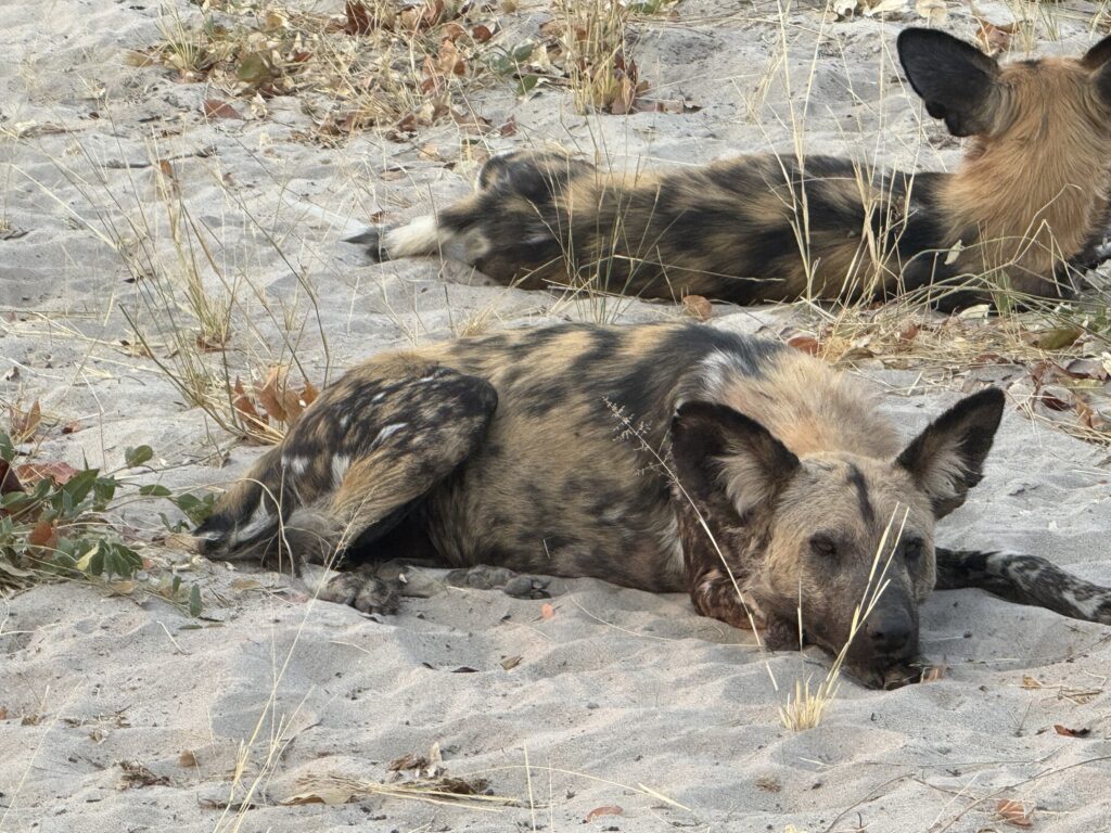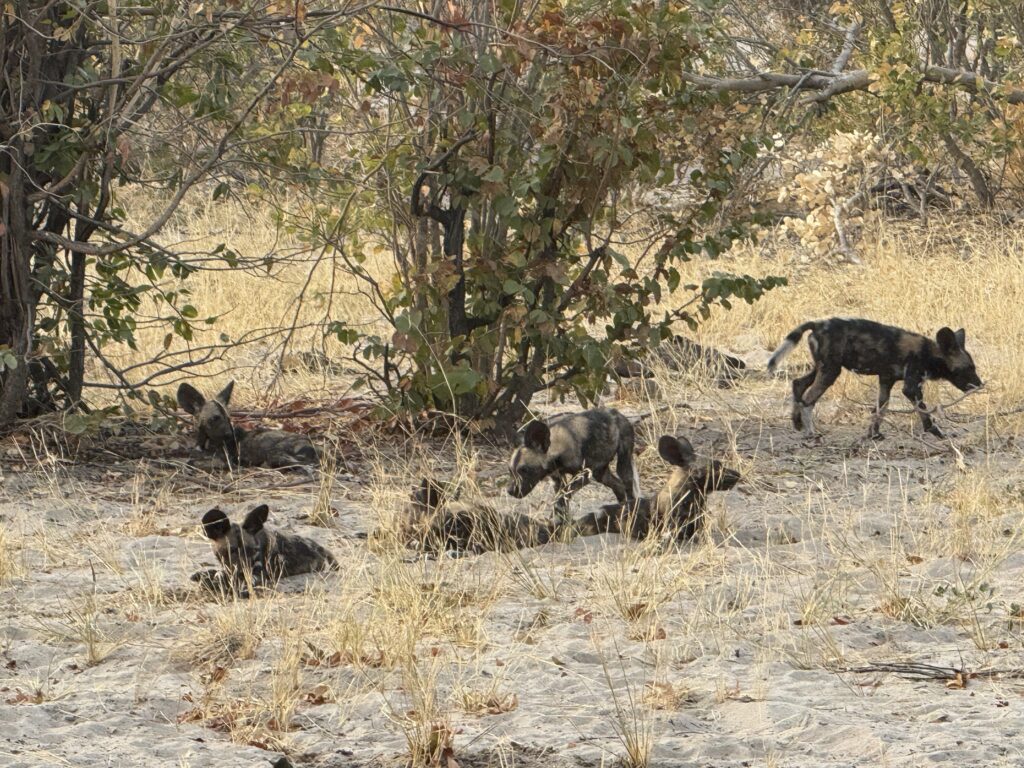 We had some free time in the afternoon as usual, and we were supposed to have an educational talk on the Okavango Delta at 4 pm. However, Ona received word that a pack of African painted dogs had been seen in the area, so we skipped the talk and jumped in the jeeps to go dog hunting. Painted dogs are also known as wild dogs or painted wolves. Many of the conservation groups prefer the name painted dog as it has a better connotation than wild dog. We drove for about an hour over rough and bumpy terrain, and finally found some tracks from the pack of dogs. We came upon them in a grove of acacia trees, all lying in the shade, and preparing for their evening hunt. The mama of the pack had given birth to 13 pups a few weeks ago, and they could not have been more adorable. They have huge ears, and it was fun to watch them interact with one another. The pack consists of about 37 wild dogs, with one dominant female and one dominant male who make all the pups. Eventually, the males venture out to start their own pack. We watched them for a few minutes until they all got up at one time and headed out to hunt down their dinner, likely an impala from the nearby herd. At least three of the females were collared for research, and we saw a research team heading in as were heading home from our morning game drive. They are endangered, and we saw posters in the Kasane airport asking people to send in photos if they saw any. Each dog has unique markings and patterns, so they can be easily identified for research. We were so very fortunate to have seen them.
