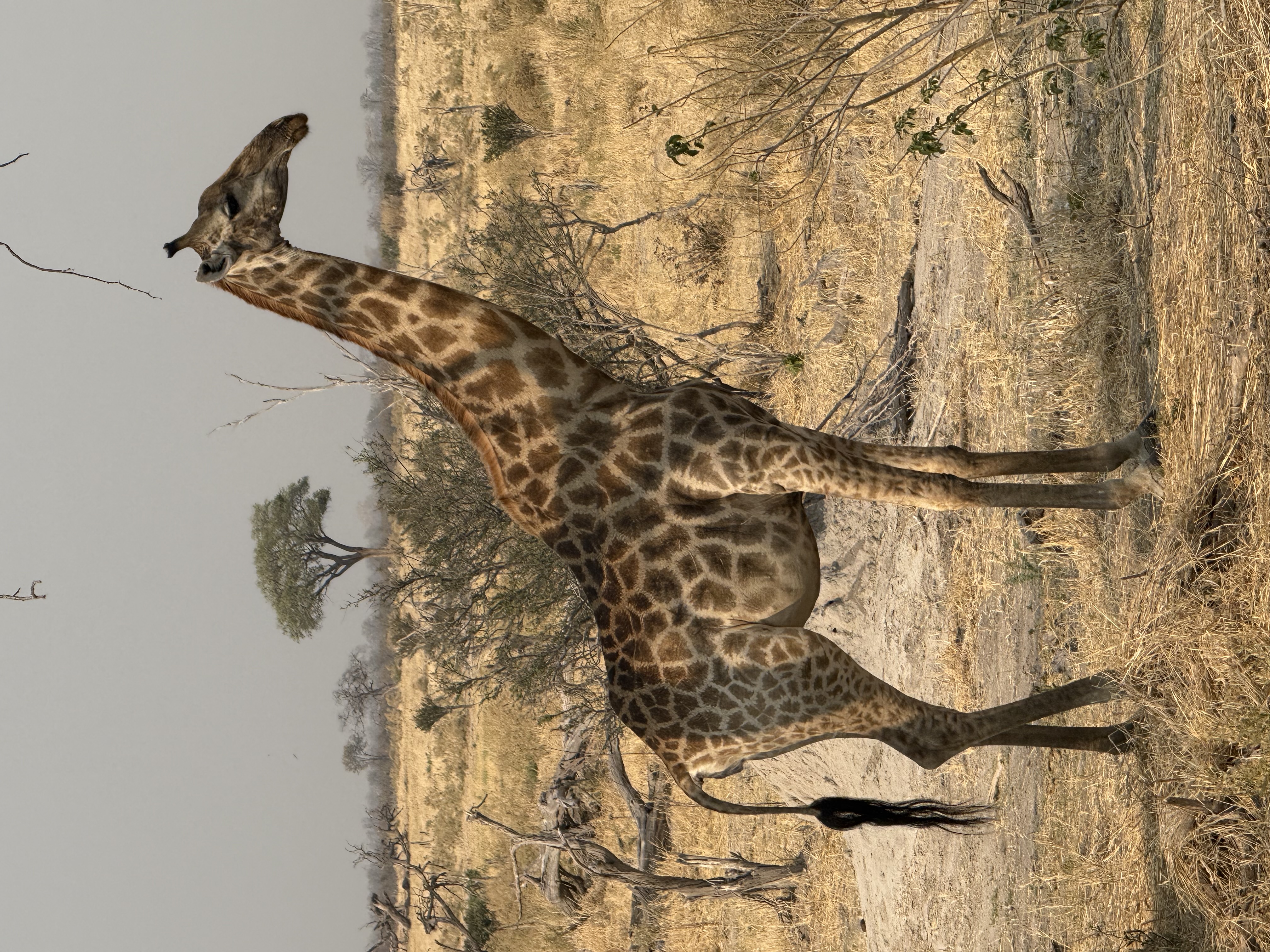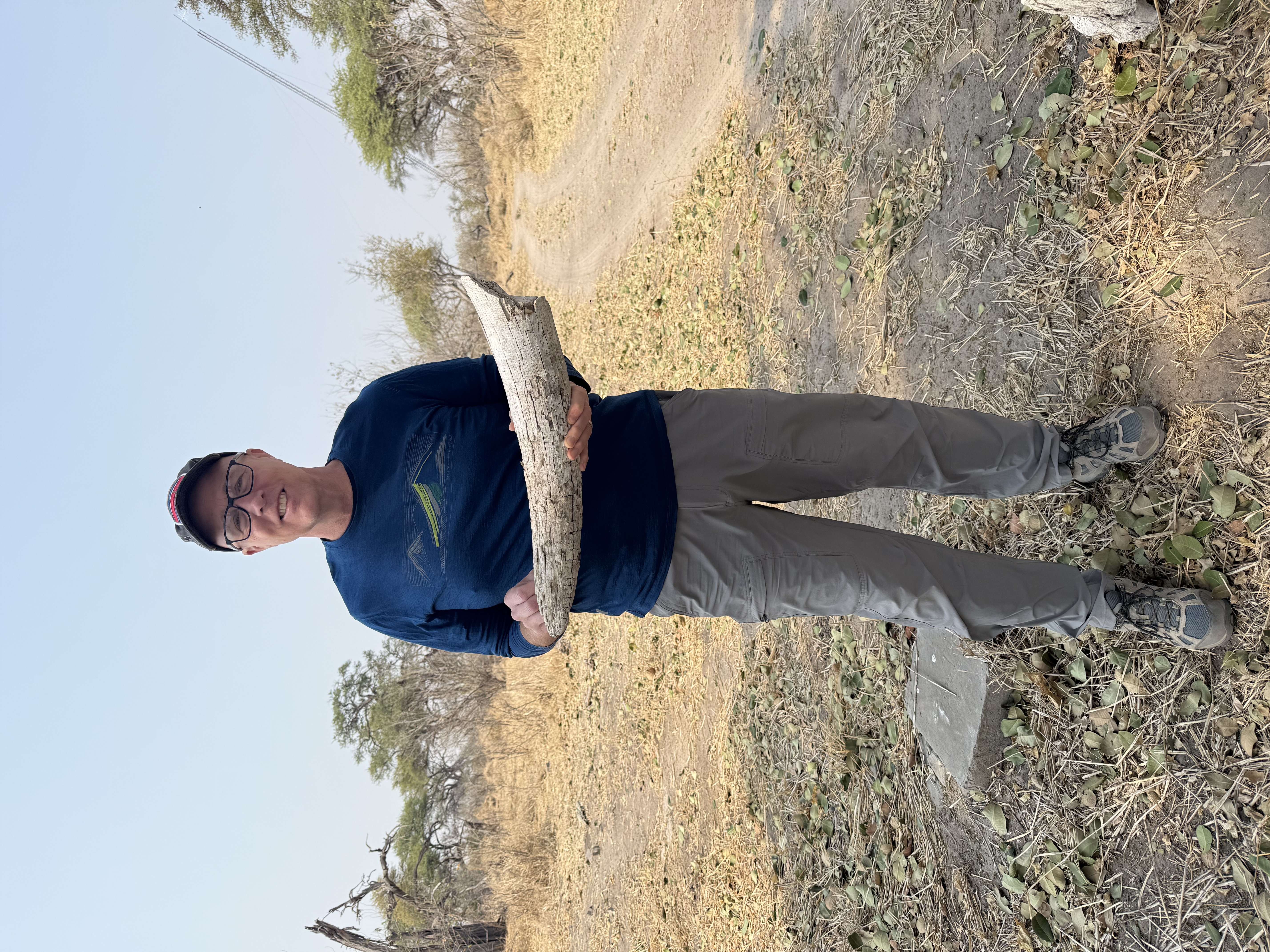 Next up, Ona found signs of kill and got out to start investigating. He then found a very long leg bone that belonged to a dead giraffe. He couldn’t be sure how it died, but many animals had been feasting on it. We then found the giraffe’s head and entire set of neck bones with a big flap of skin still attached. I said, “man I wish we could get out of the truck and see it up close” and Ona said go ahead! It is quite unusual for a guide to let the guests out of the truck on a game drive, so we were incredibly lucky. We got to see it up close and touch it. The hair was very soft and you could count all seven neck vertebrae. They have the same number of cervical vertebrae as humans, but they are just a little bit longer than ours. ;)