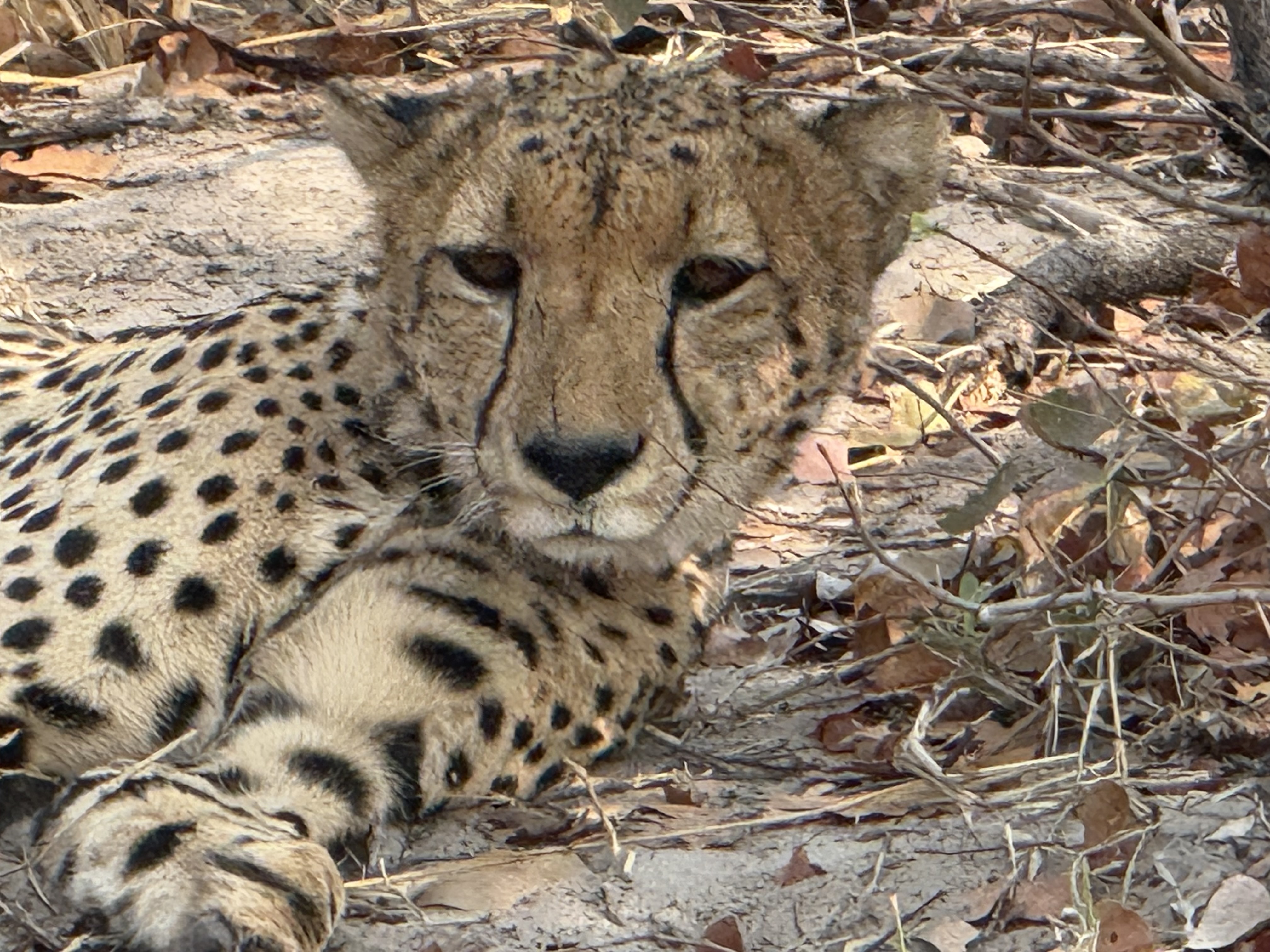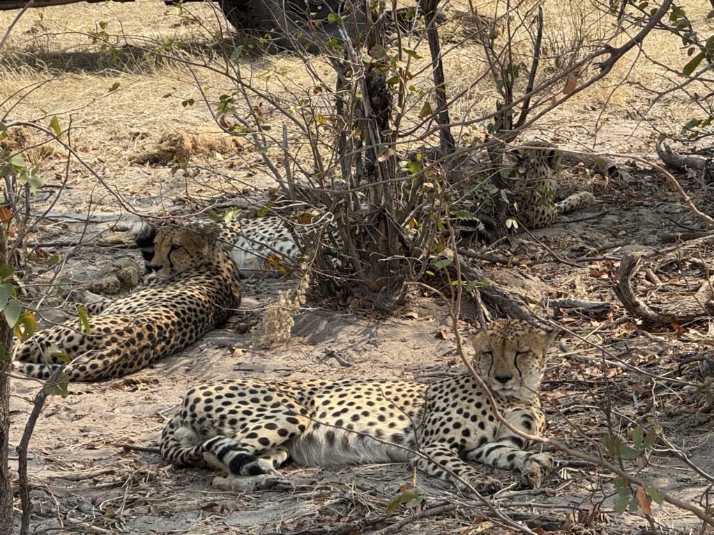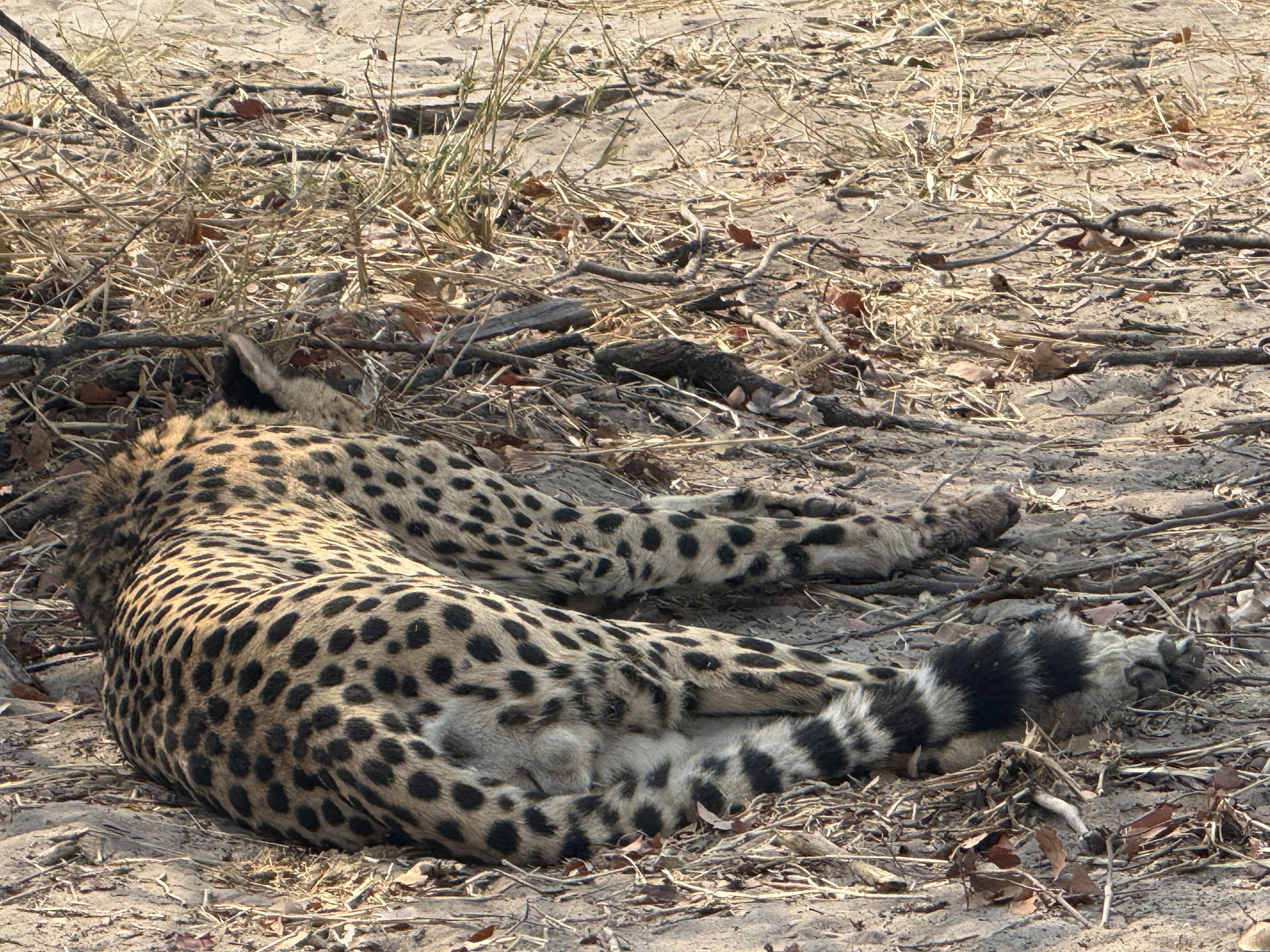 As if that weren’t enough, on the way back to camp, we encountered the young male leopard we had seen yesterday, resting in a tree, with his paws hanging down, closely watching the impala below him. He’s too young and too small to take one down on his own, but by the look in his eye, he clearly wished he was big enough. He could not have been more adorable. We also checked on the female cheetah with the impala, and she had eaten about half of her meal and had moved to the other side of the bush for more shade while she took a break from feasting. So that’s five cheetahs and one leopard all in the same morning game drive. Incredible, just incredible.