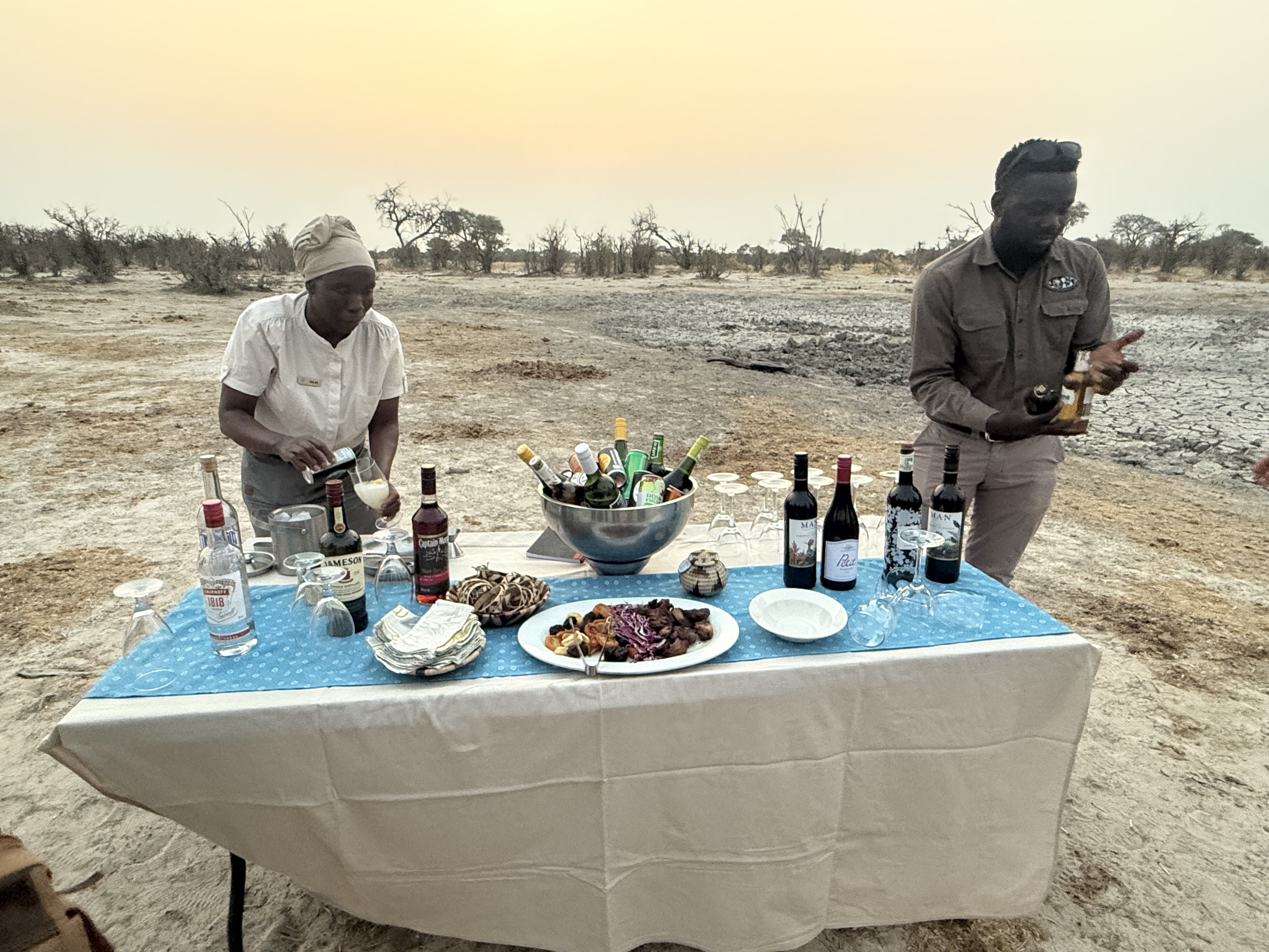 As we started heading back to camp, we pulled over for our evening sundowners. We were so very surprised to find out that two of the hard working people from our camp had loaded up a jeep with snacks and drinks and driven out to meet us in the bush. They had prepared a beautiful table with drinks to order. Usually, our sundowners are packed into a cooler and loaded into our truck before we leave camp, then served by Wonder and the guides. Don’t get me wrong, it’s all great! But having them come out to meet us in the bush was really a beautiful surprise. It was such a beautiful evening.