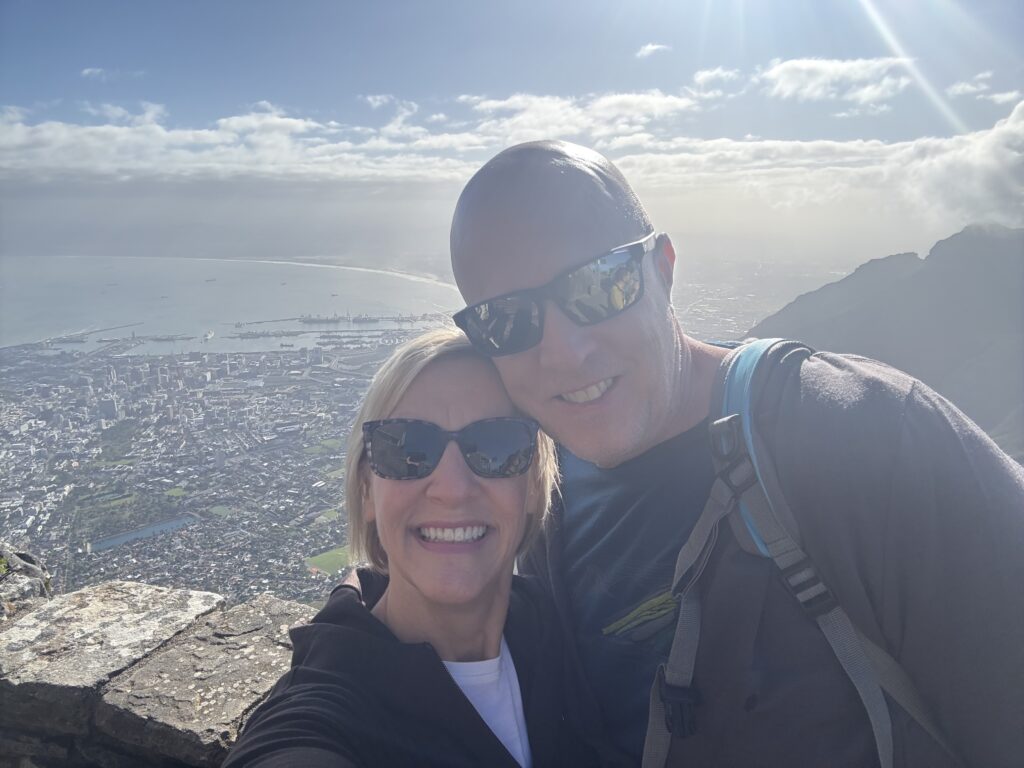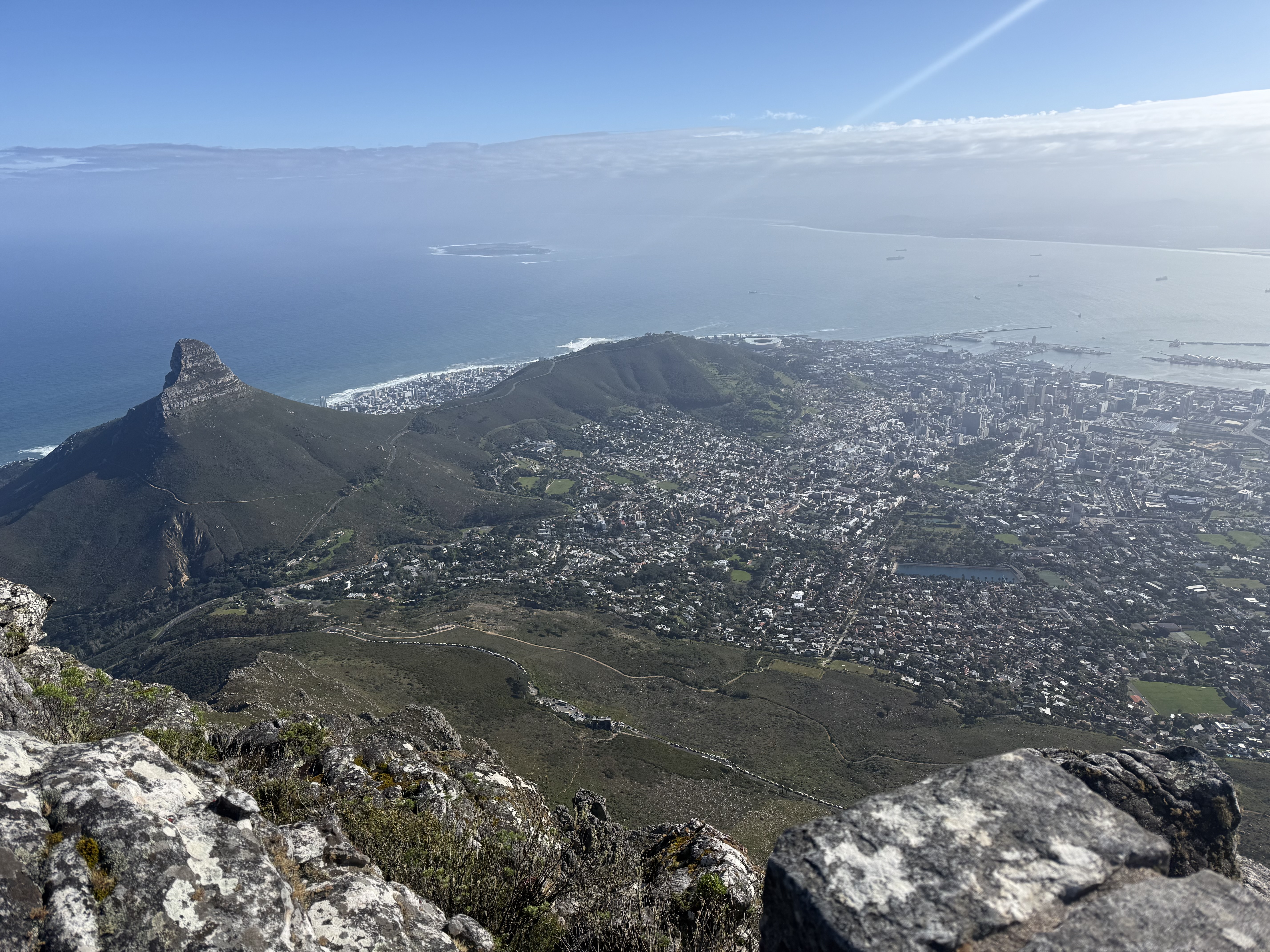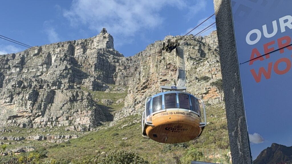 On Tuesday, we woke to beautiful sunny weather and took our trip up Table Mountain in a gondola. In Cape Town, you have to strike when the  proverbial iron is hot. Since it is still very late winter here, the weather can vary a great deal. Table Mountain is Cape Town’s most iconic landmark, and it, along with the harbor, creates a stunning bowl that the city is situated in. The gondola was built in and opened in 1929. The current cars, installed in 1997, carry 65 people each in a 5 minute ride to the top of Table Mountain at an elevation of 3501 feet. The highest point on Table Mountain is 3558 feet. From the city center where our hotel was located, the cars were barely visible to the naked eye and it looks like a harrowing ride to the top, but it was fun. The internal floor of the cars rotate, so no matter where you are in the car, you still get to see the views on the way up and down. The views from the top are spectacular and this is not to be missed on a trip to Cape Town. I think Steve would have rather kept his feet on the ground, but he was a good sport and enjoyed it. For the last few feet on the way up, it looks like you are going to smash into the side of the mountain. I kept saying “pull up!” and he was not amused. Perspective is everything. Even though the weather is sunny and 65 deg F on the ground, it was, dare I say, cold at the top. Layers are your friend here.