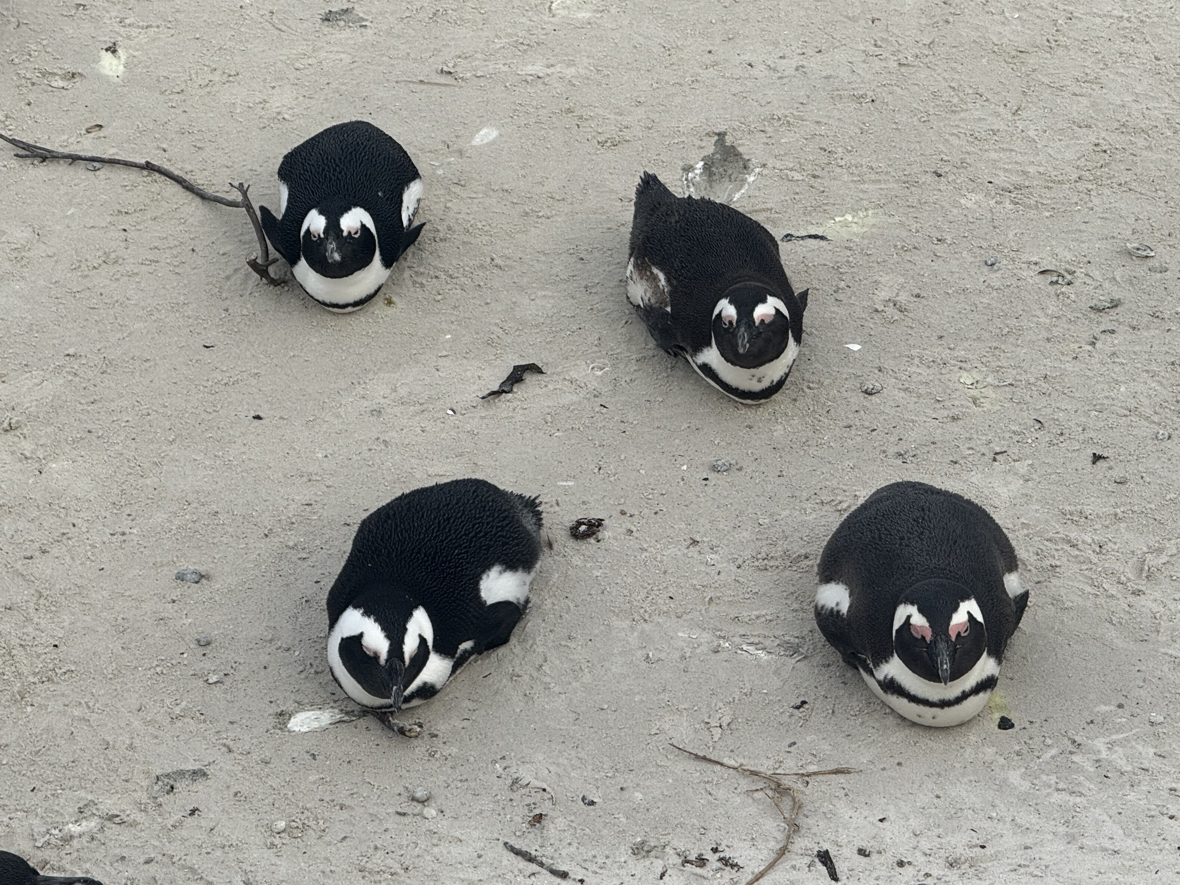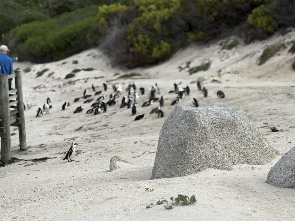We continued our drive up the eastern side of the cape, and had lunch at Fran’s, a locally famous restaurant with delicious authentic African food, in Simon’s Town. Simon’s Town is known for being the home of South Africa’s largest Naval Base, and is full of quaint shops and restaurants. We had time for a stroll after lunch, so a few folks did some shopping and had an ice cream, and we found a little coffee shop (we never pass up a good coffee shop). We finally stopped to see the African penguins at Boulders Beach. I must admit I did not know there were penguins native to South Africa. They are cute little boogers who mate for life and bray like a donkey, giving them the name Jack Ass penguins. We heard it, and the sound is remarkably difficult to distinguish from an actual donkey.