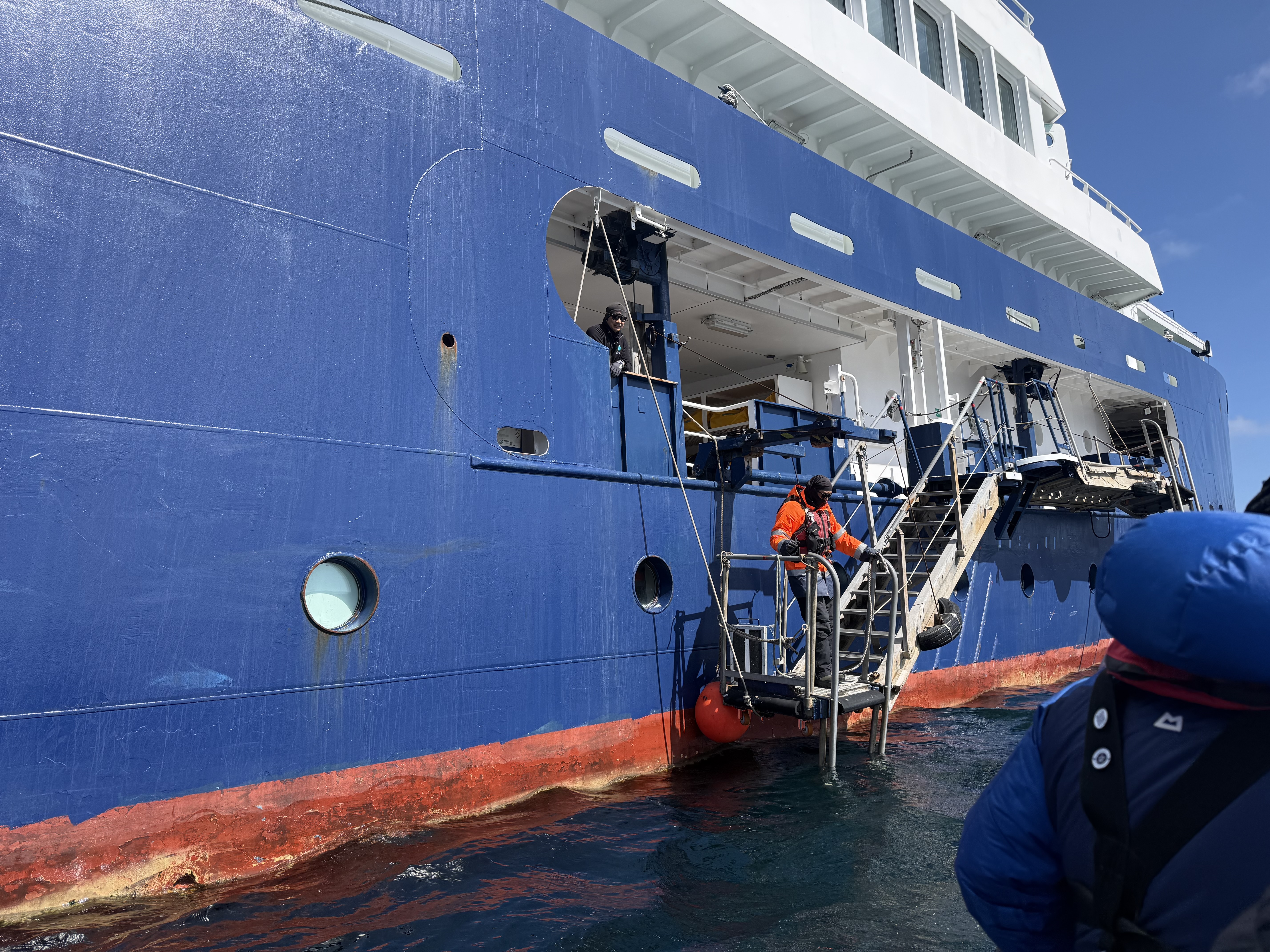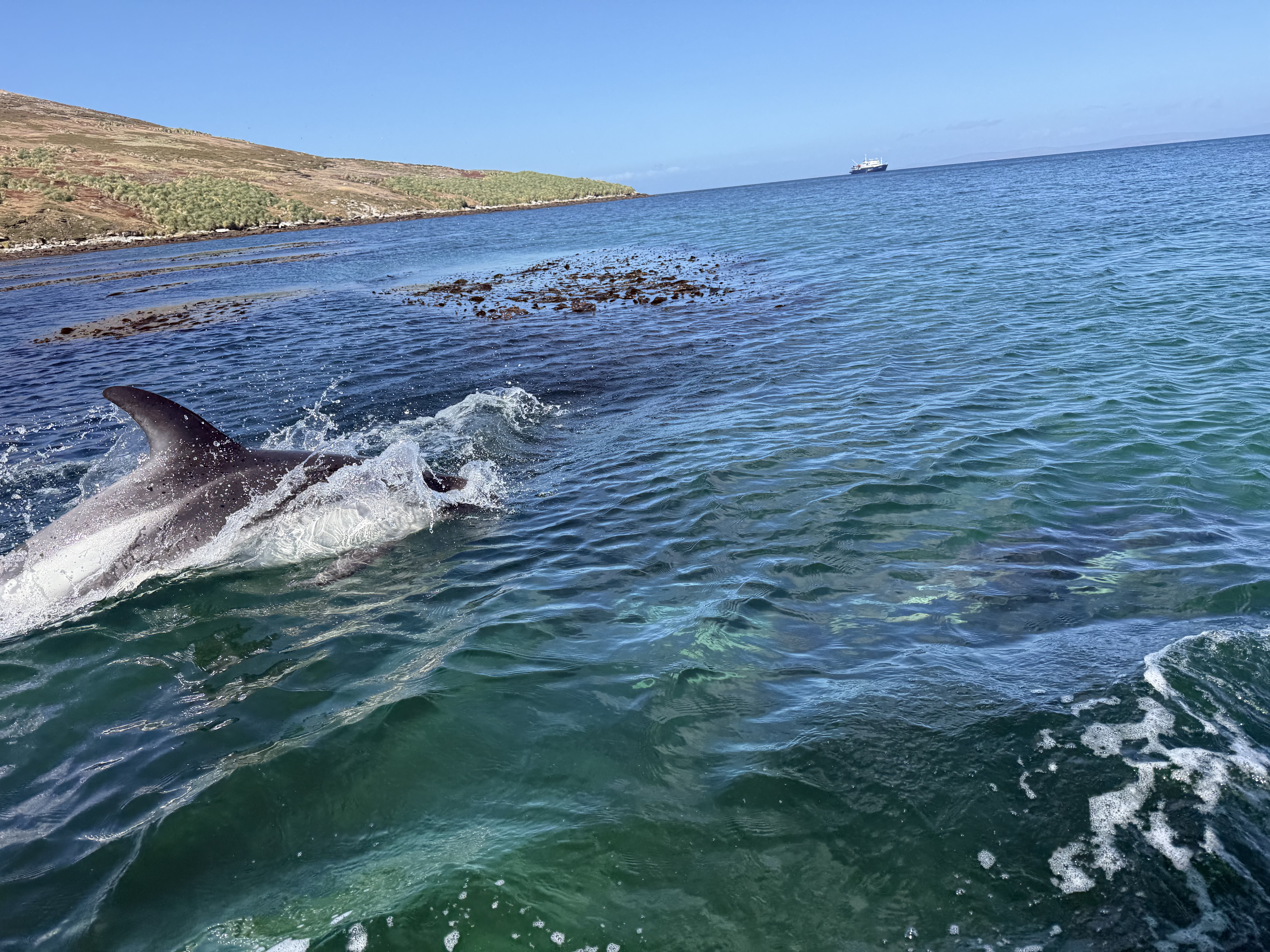One the way back to the ship, we raced a pod of Peale’s Dolphins. The dolphins were clearly having fun racing alongside the Zodiacs. They gave us a pretty good show and a few people got a bit wet from all the splashing. This is the reason you have to wear waterproof pants and coats on the Zodiacs.