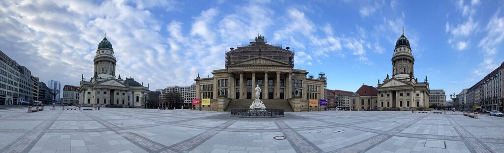 Today we took it easy for a bit, then headed next door to the Deutscher Dom (German Church). It is one of the twin churches located in Gendarmenmarkt, which is widely considered to be the most beautiful public square in Berlin. The French Church was built first in 1701, but the Germans were not to be outdone, so they built a twin church on the other end of the square, but made it 14 cm taller than the French Church, according to the local guide we hired on Wednesday. Between the two beautiful churches lies the Berlin Konzerthauz (concert hall).