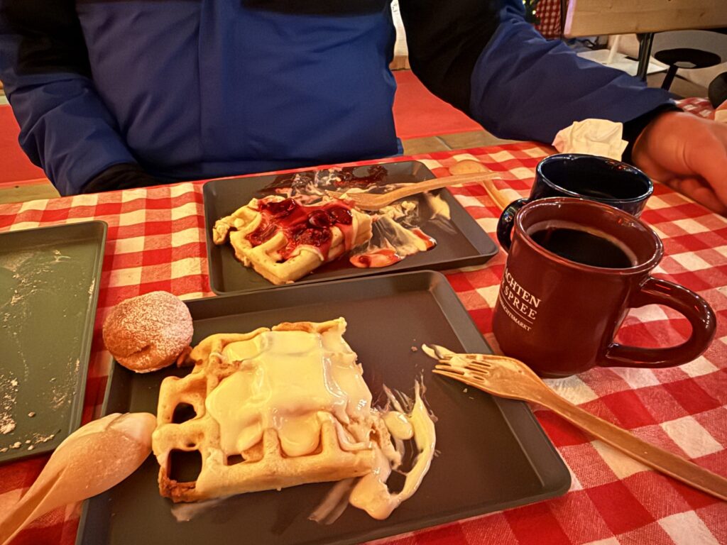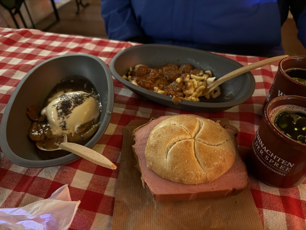 After that we headed out to the Weihnachtsmarkt un der Spree (Christmas Market on the Spree River). It is an all inclusive market where you pay a fee and get a wristband. So we tried All. The. Food. We had the Leberkase, which translates to liver cheese and contains neither liver nor cheese. Instead, it’s a beef, pork, and bacon meatloaf, but it’s very finely ground to the consistency of a hot dog, shaped into a loaf, and baked. It was quite tasty. We also tried the Goulash and Spaetzle (beef stew and noodles), and the Germknödel, which is a sweet fluffy yeast dough dessert with vanilla sauce. Next up was the waffle and vanilla sauce, followed by the Quarkbällchen, which is a deep fried cheese dough ball sprinkled with powdered sugar. Someone please roll me back to the train.