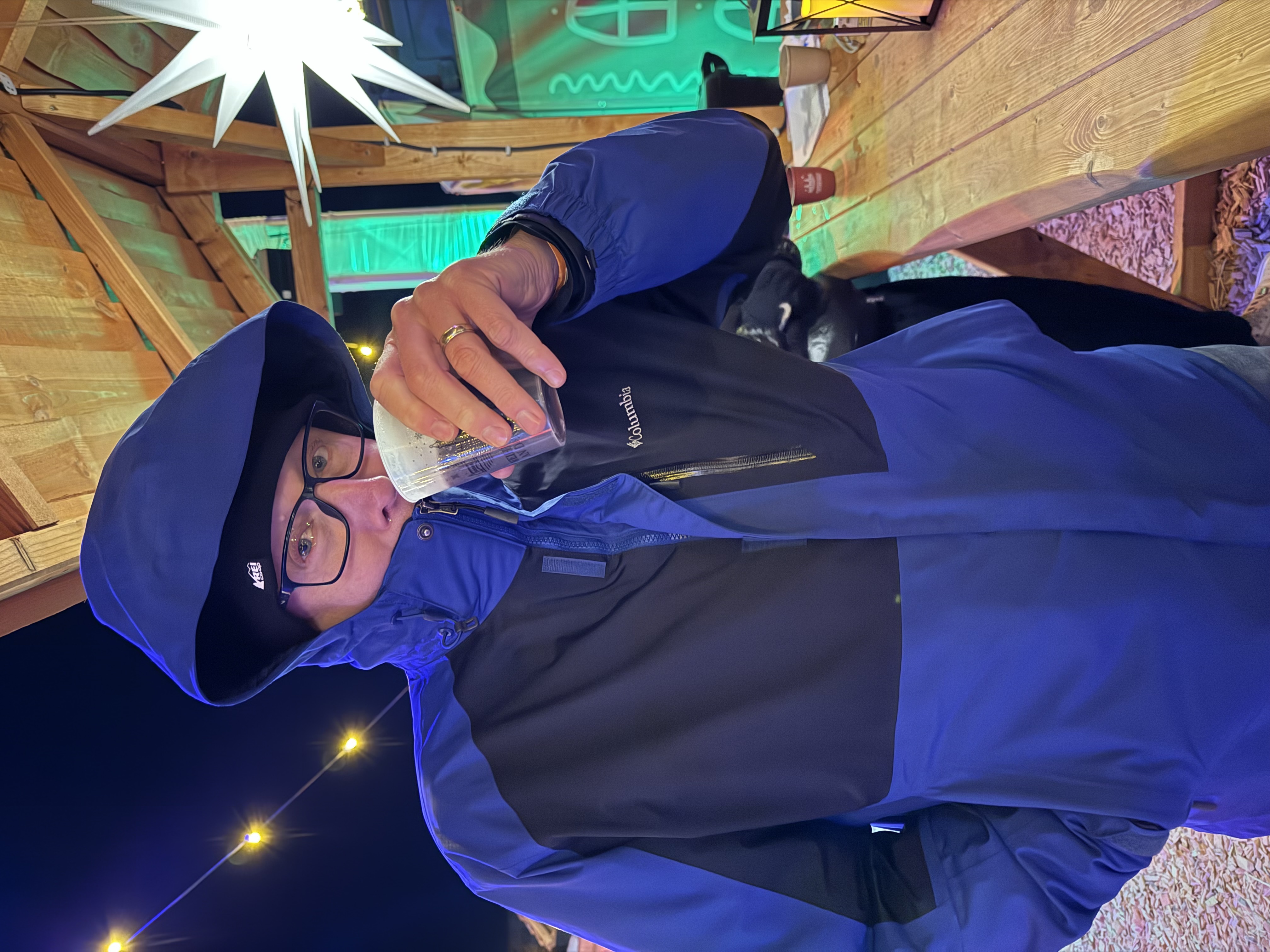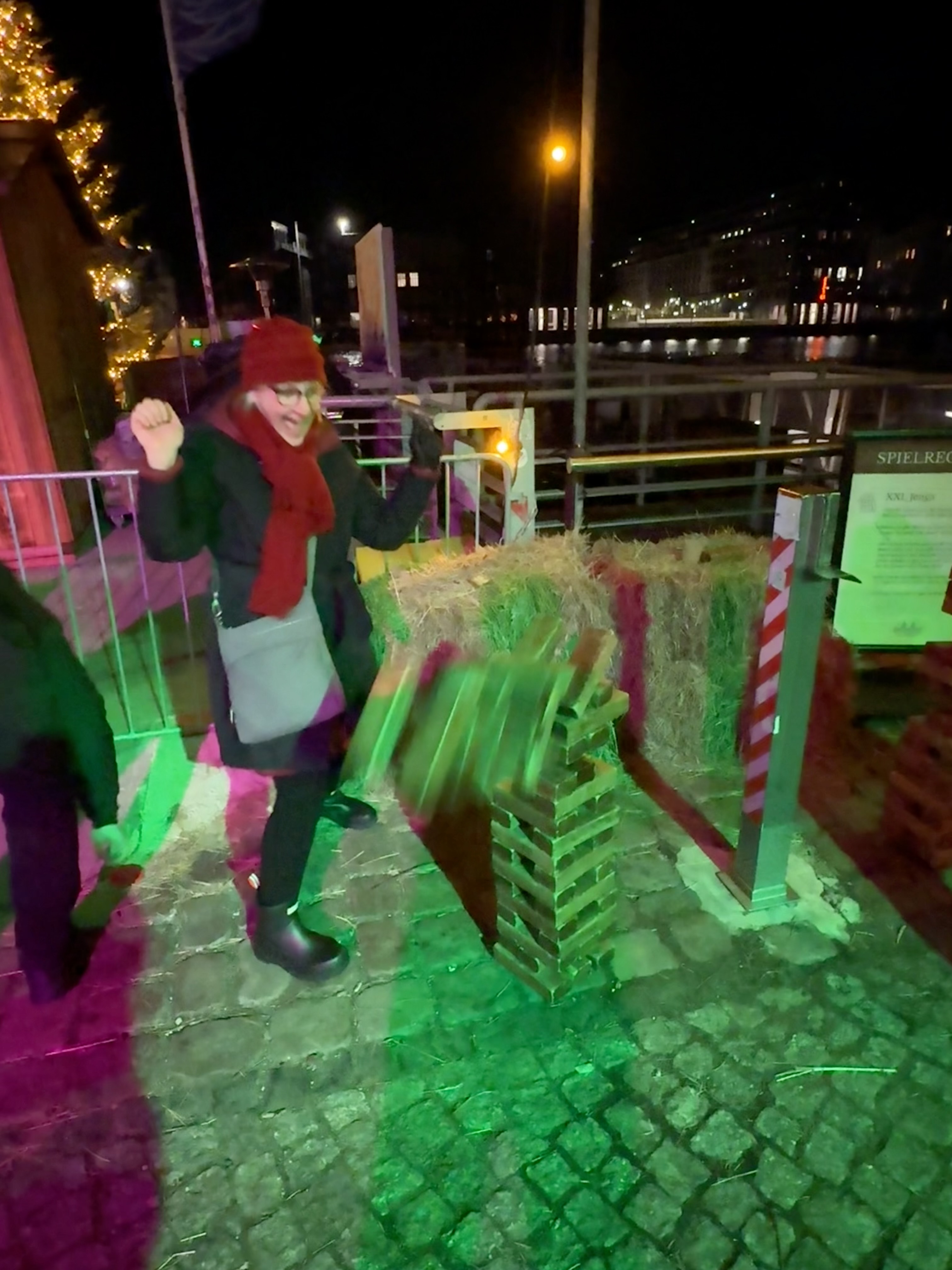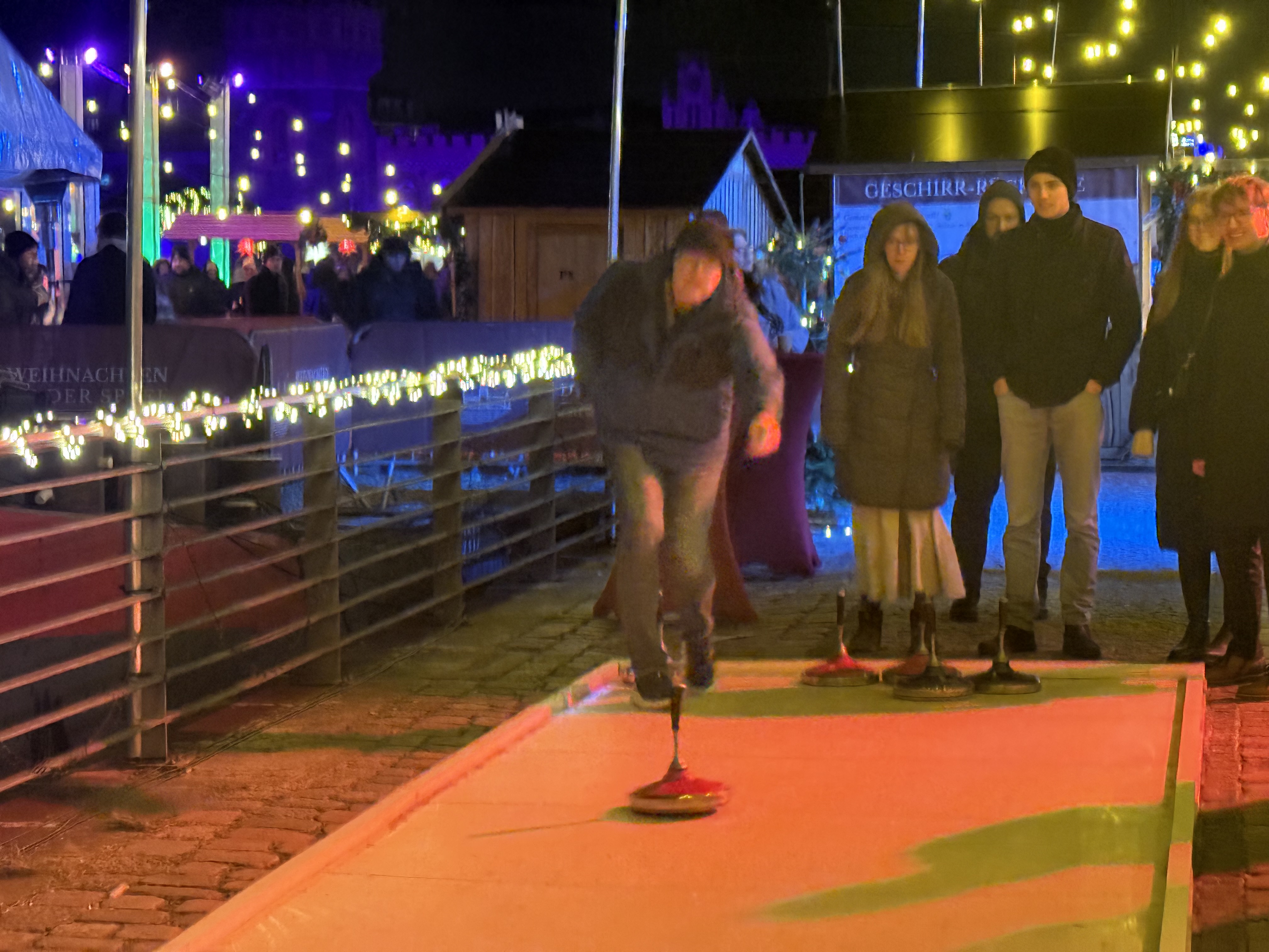 We needed to work off some calories, so we tried our hand at curling (we suck), giant Jenga, and driving nails into a log. We did not see the need for, or the fun, in that last one, but hoped it would keep us warm. Spoiler alert: it didn’t. The temp was 28 deg F and felt like 21 deg F. Shall we just admit that Berlin is cold? We were sufficiently chilled by this point, called it a night, took the train home, and got off at the correct stop this time. We are trainable.