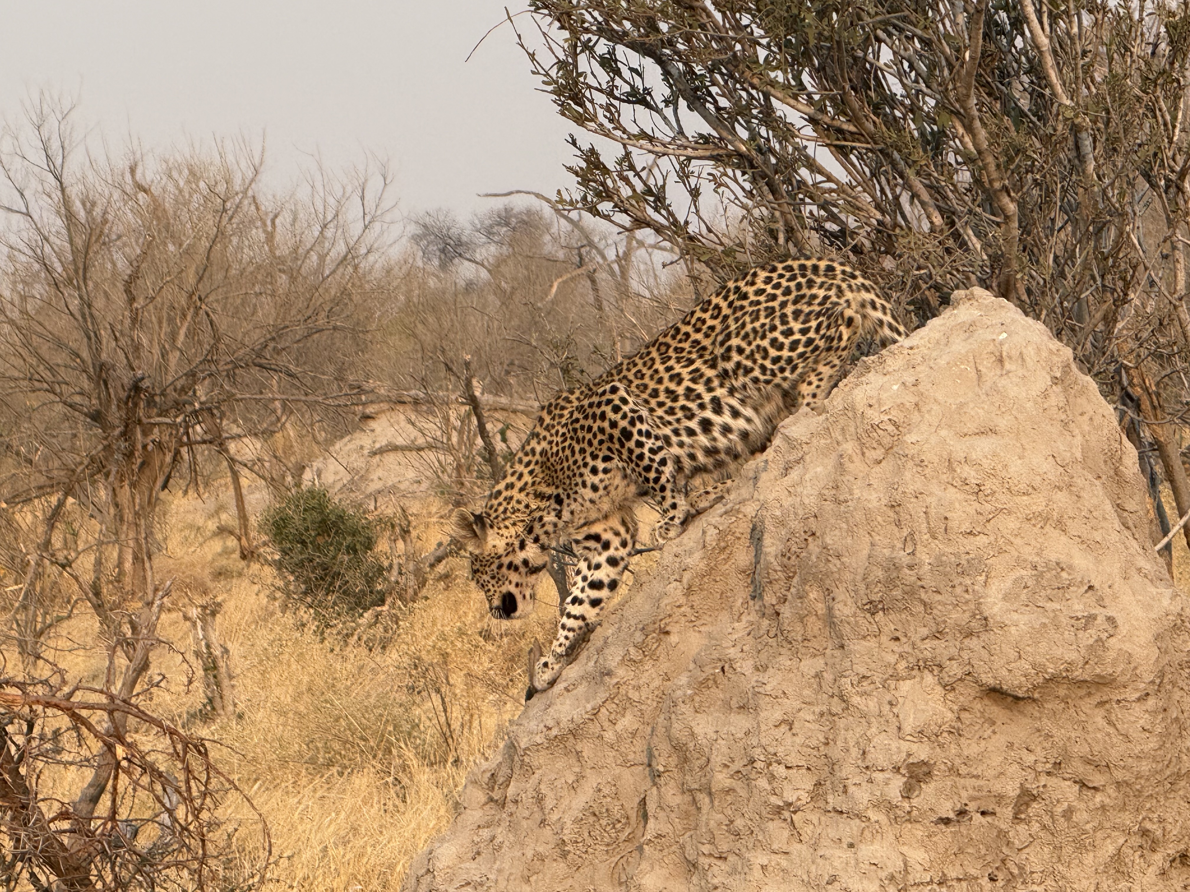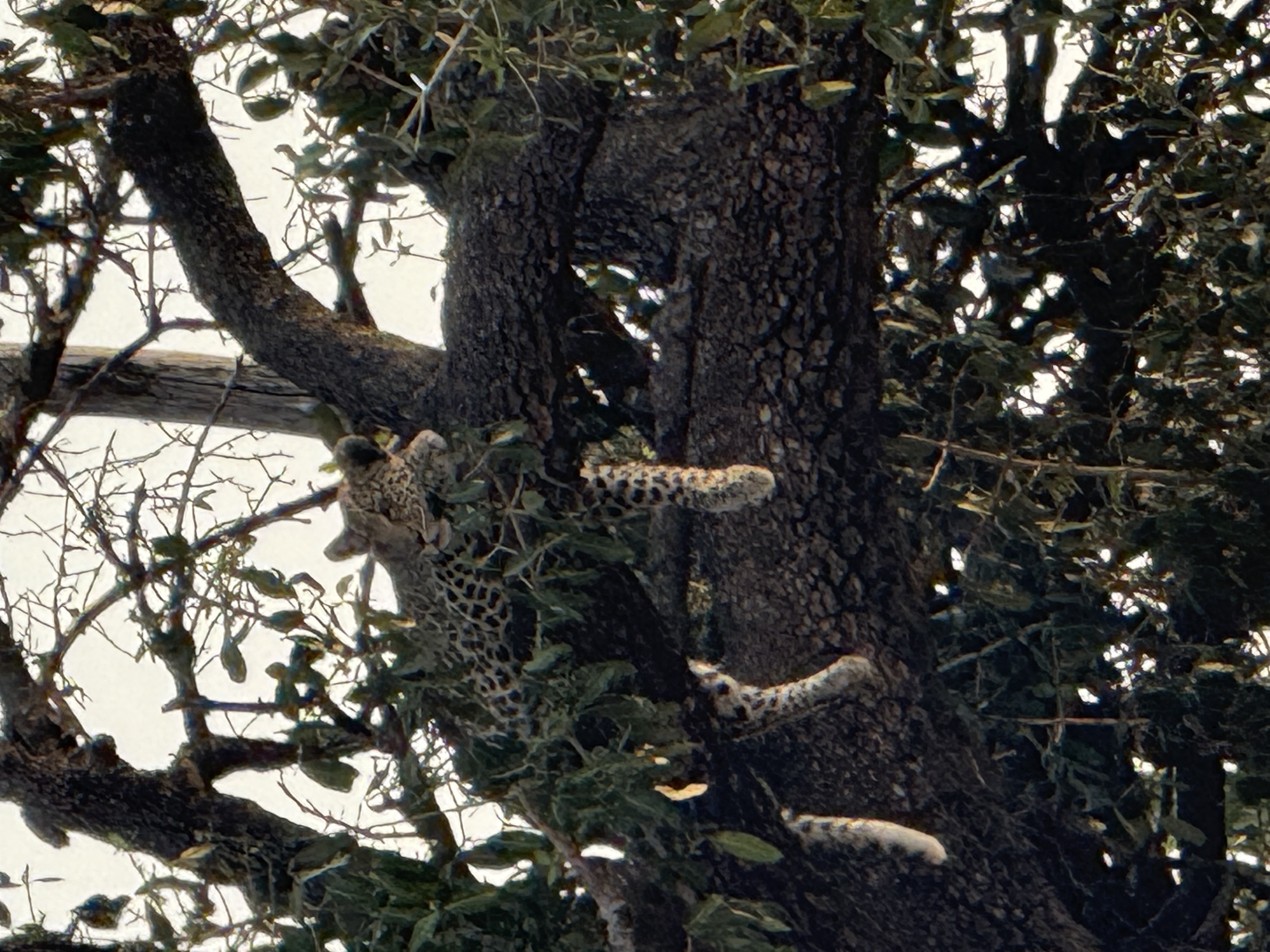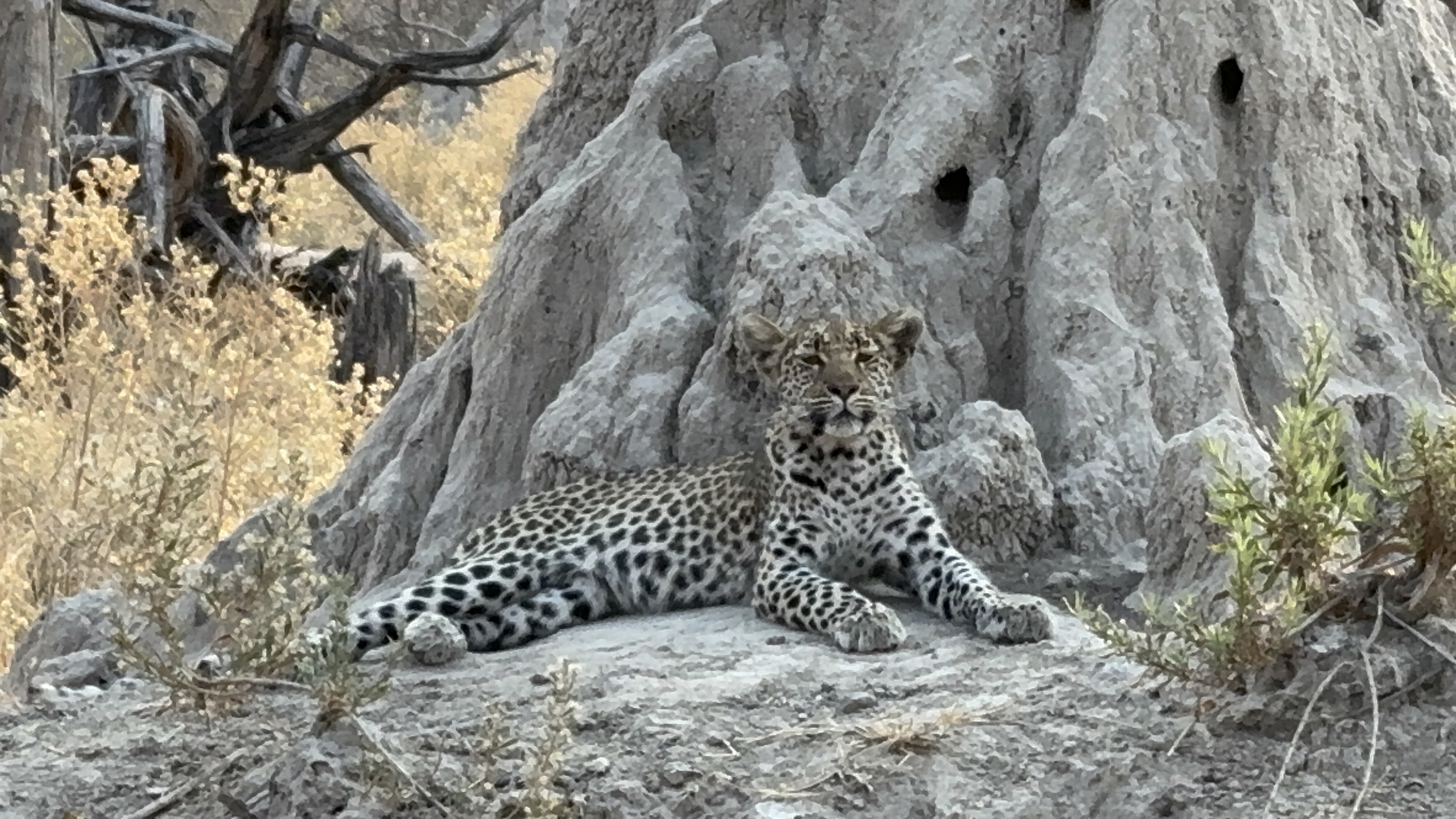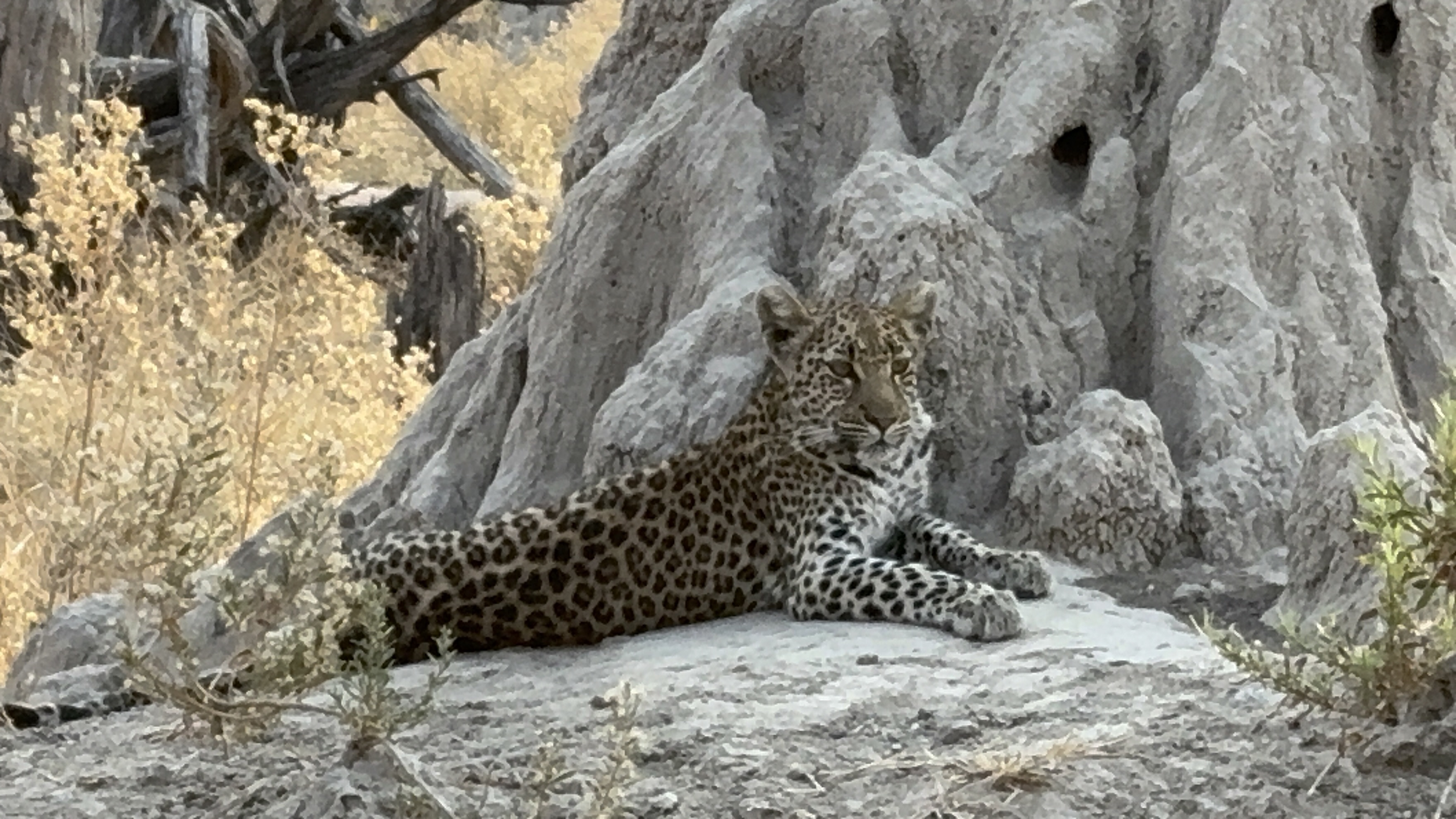 In the late afternoon, we set out on another game drive and immediately encountered two young leopards. Score!!! They were a brother and sister and mama was likely nearby but we never saw her. One was in a tree with his paws hanging down, exactly like you see in photos, and one was resting in the shade of a giant termite mound. We watched them for quite a while before moving on to see what else we could see. When they find elusive animals like leopards, the guides call out on the radio to the other guides in the area, so we had a couple other trucks join us, but this area is not at all crowded like Chobe.