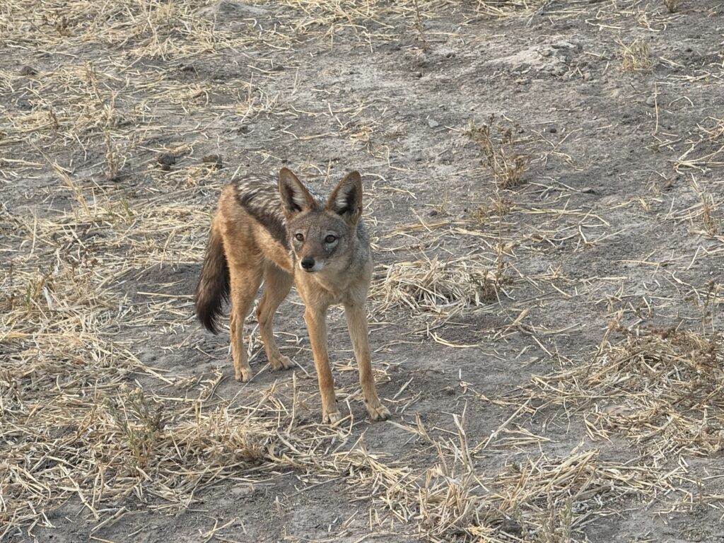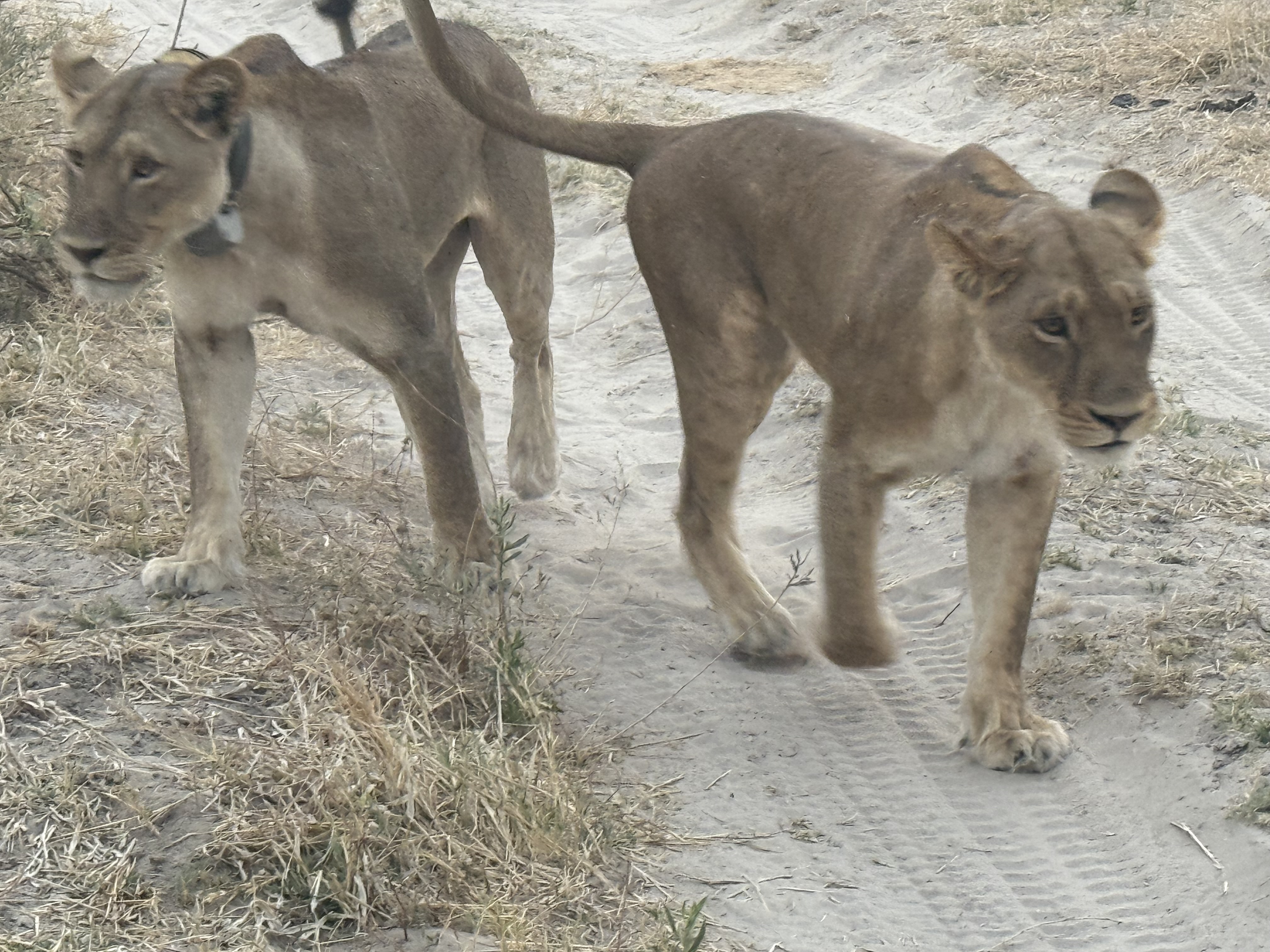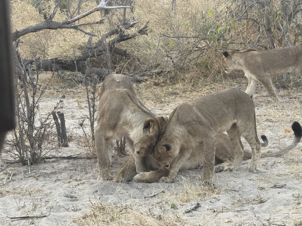 The bush was kind to us today because we saw a family of jackals with two cute little babies coming out of their den in the ground. We also saw quite a few impala, some elephants, a giraffe, and some tsessebe antelope, which we had not seen before. It wasn’t long before we encountered the pride of eleven lions again and this time it was evening and they were wide awake and on the hunt. We watched them spread out and surround a small herd of tsessebe antelope and impala, but they were spooked when the birds started calling out danger signals. It was getting dark by this time, so as we were heading back to camp for our dinner, we watched the lions regroup and start to figure out a new plan for their dinner. We could hear them roaring as we walked to our cabins later in the evening.