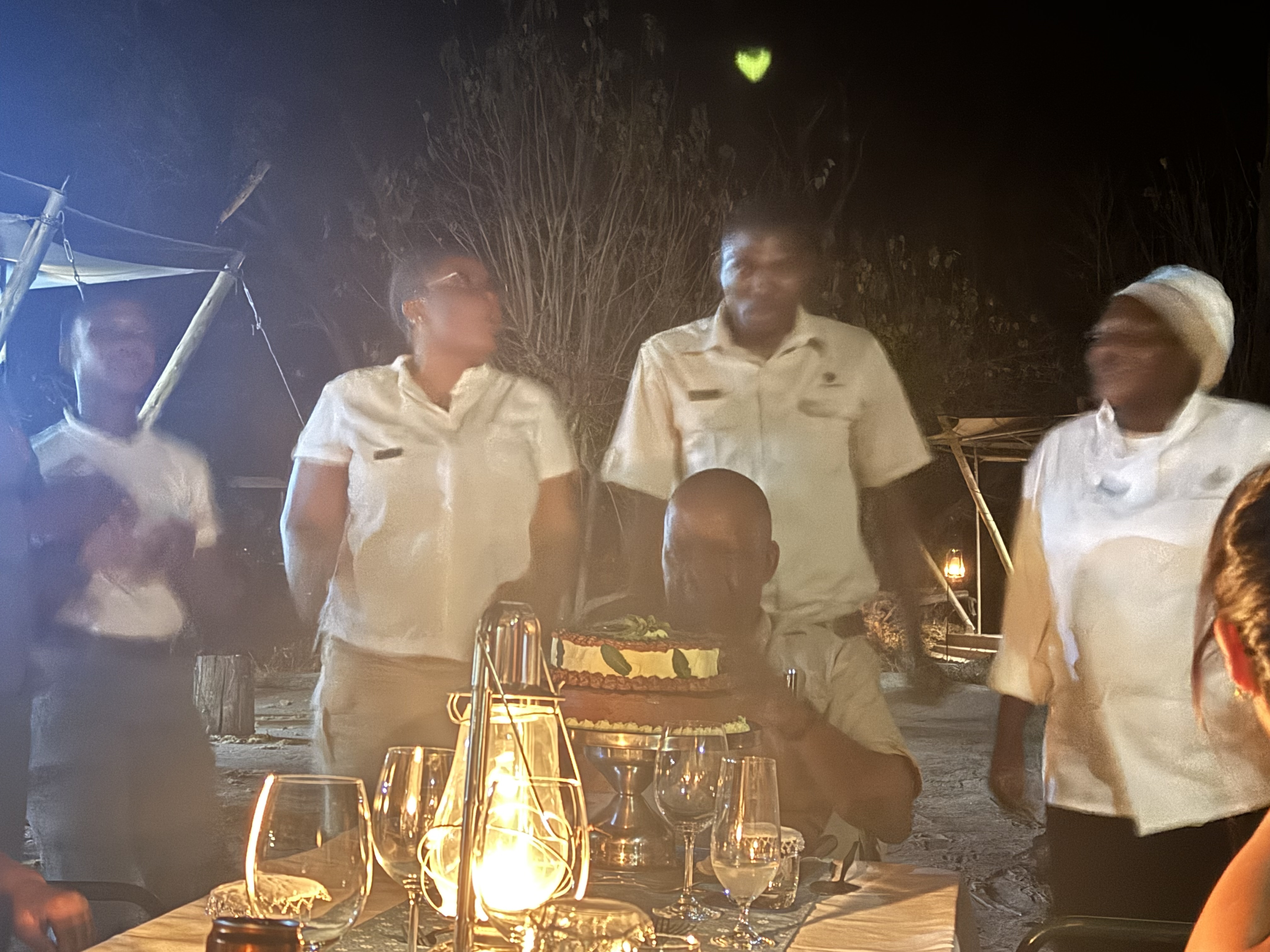 When we returned from our 5 star game drive, the camp staff had set up a beautiful dinner outside for us. We had a lovely dinner by lantern light. Our guide Ona, had a birthday today and the staff prepared a special celebration for him and we sang to him also. It was another very special evening with the amazing staff. The staff is really appreciative for all of us being here. The tourism industry provides jobs and opportunities for lots of folks who otherwise would not have the income they are able to earn by working here. They spend six to eight weeks at a time away from their families and go home for two weeks. At all the Wilderness owned camps, they work from March 15 to November 15 while the tourism season is in full swing. They want everyone in the US to know they want us all to come visit!