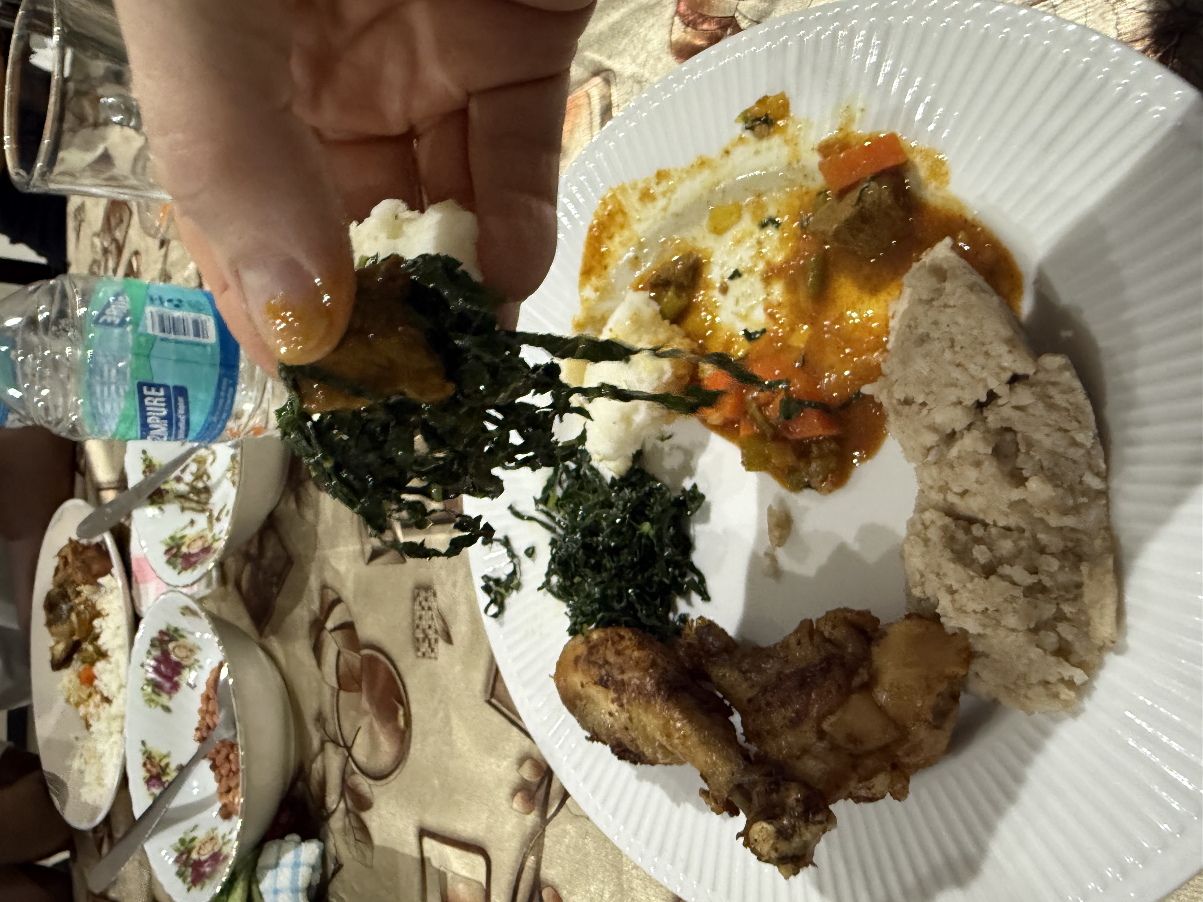 We had a traditional dinner of chicken, vegetable stew, white rice, peanut butter rice, polenta, and kale. Before dinner, Memory knelt down on her knees, and washed all our hands using a kettle of warm water and a basin to catch it. This is common in the villages, where we had experienced it previously, as well as in the cites. Steve was the only male in our small group, so she did his hands first and served him first, as per tradition. I asked her if this tradition was changing with the times, and she said definitely not. Respect for men and elders is taught to all generations, and it is expected and practiced. Don’t get me wrong, the women are also very respected, and young men are taught to respect women. There are consequences doled out by the families when respect is not practiced.